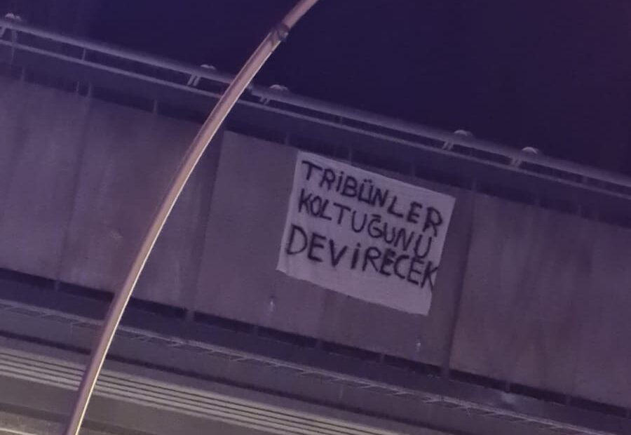 Kayserispor – Fenerbahçe maçına deplasman yasağının gelmesinin ardından Ankara Söğütözü’nde bulunan AKP Genel Merkezinin bulunduğu kavşağa, “Tribünler koltuğunu devirecek” pankartı asıldı.
