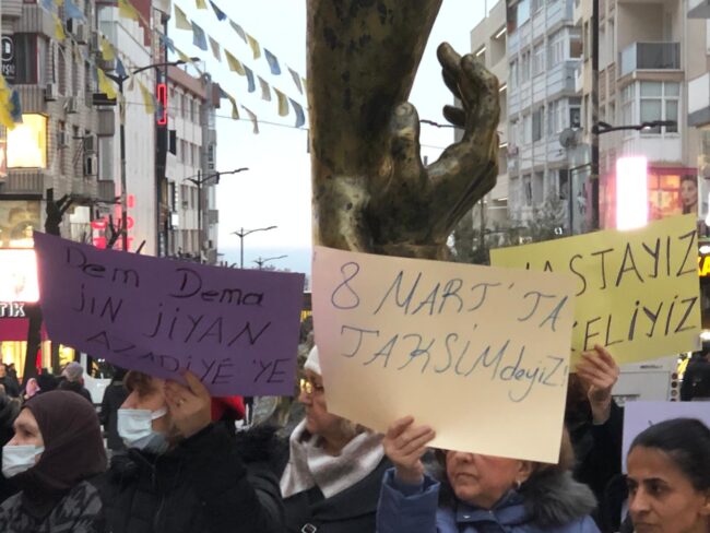 Savaşın, yoksulluğun, cinsiyet eşitsizliğinin ve muhafazar politikaların sonucu neredeyse her gün bir kadının katledildiği, LGBTİ bireylerin her türlü şiddete maruz bırakıldığı, haklarını savunanların cezaevlerinde rehin tutulduğu, kadın emeğinin rekabetçi, güvencesiz, esnek ekonomi politikaları dayatılarak sömürüldüğü, kadınların hukuksal haklarının gaspedildiği, kadını sadece aile ile tanımlayan, onu toplumsal alandan dışlayan gerici- ataerkil politikaların dayatıldığı, kadını güçsüzleştiren ve erkek şiddetine karşı savunmasız bırakmayı amaçlayan bu baskıcı ve çürümüş AKP-MHP iktidar bloğuna karşı kadın mücadelemizi yükselteceğimizin sözünü veriyoruz.