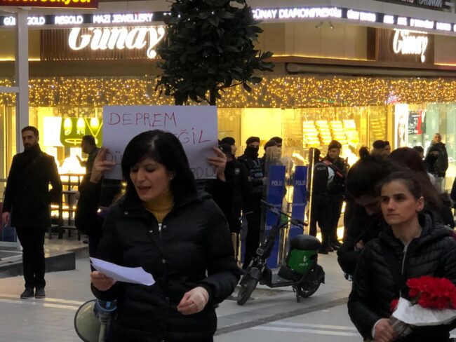 Marmara Caddesi’nde bulunan Deprem Anıtı önünde basın açıklaması yapan kadınlar, 5 Mart Kadıköy’e, 8 Mart’ta Taksim’e çağrı yaptı.