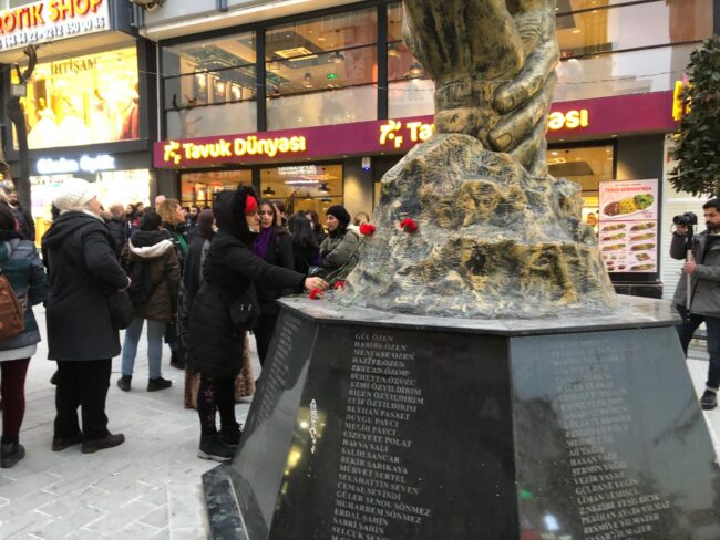 Kadınlar basın açıklamasının ardından Deprem Anıtı’na karanfil bırakarak eylemlerini sonlandırdılar.