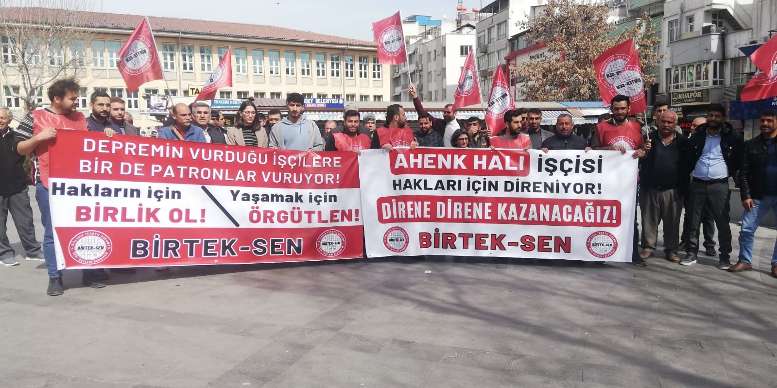 Deprem bölgelerinde işçilere yönelik işten atmalara ve diğer hak gasplarına karşı Antep Balıklı Parkı’nda Birleşik Tekstil, Dokuma ve Deri İşçileri Sendikası’nın (BİRTEK-SEN) çağrısıyla eylem yapıldı. 6 gündür direnişte olan Ahenk Halı işçileri de eyleme katıldı.