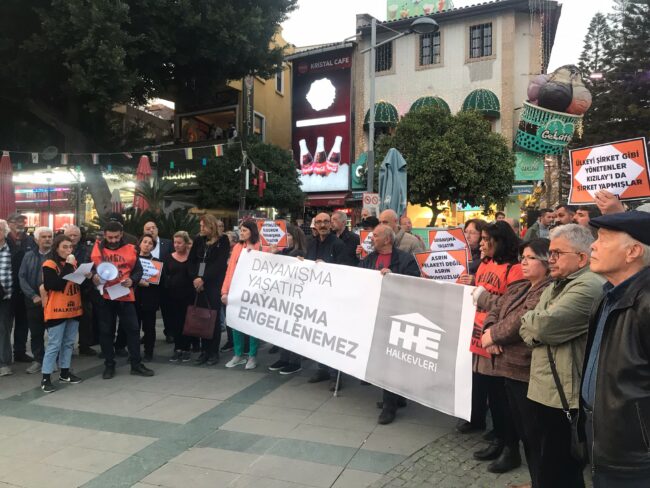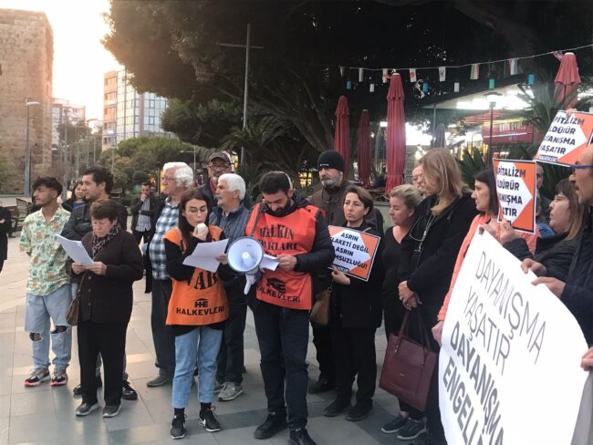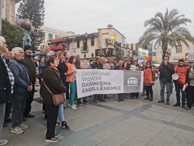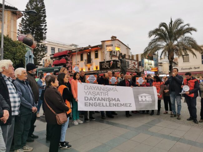 Antalya Halkevi, dün Hatay Defne’de dayanışma noktalarının zorla tahliye edilmek istenmesini ve Ankara’da Halkevleri Genel Merkezi önündeki polis saldırısını protesto etmek için Attalos Heykeli önünde eylem yaptı