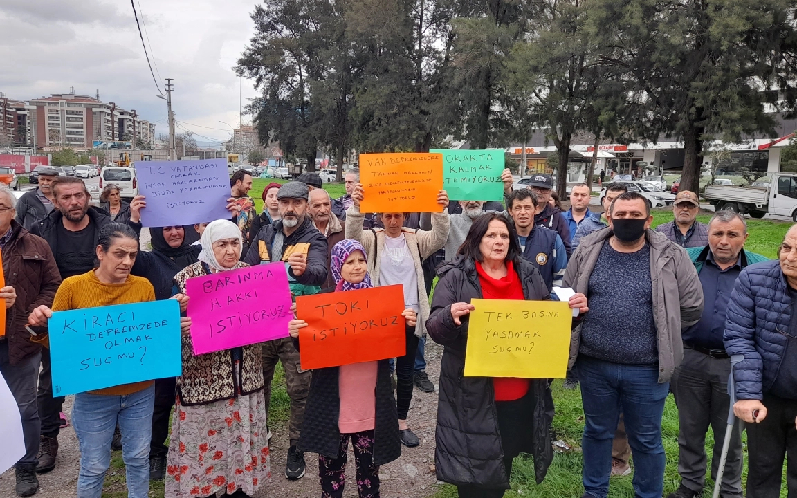 Deprem konutlarının peşkeş çekildiğini kaydeden yurttaşlar, “Bizim en temel hakkımız olan barınma ve yaşam hakkımızı elimizden alıyorlar. İnsanlar 1 haftada ev bulup çıkamazlar, sen barınma haklarını ellerinden alırsan bu insanların isyan hakları doğar” diye konuştu.