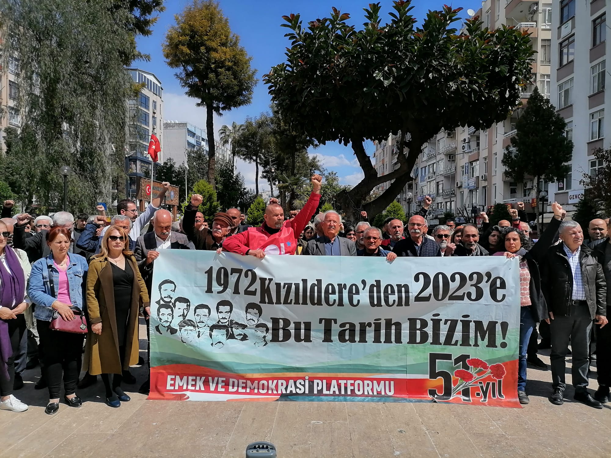 Mersin Emek ve Demokrasi Platformu’nun çağrısıyla Özgür Çocuk Parkı’nda bir araya gelenler “Onlara Sözümüz Devrim Olacak”, “Kızıldere Son Değil Mücadele Sürüyor” sloganlarını attı. Eylem bir dakikalık saygı duruşuyla başladı. Sonrasında basın açıklaması yapıldı. Basın metnini okuyan Mersin 68’liler Derneği Yönetim Kurulu Başkanı Hasan Kapıkıran şunları söyledi: