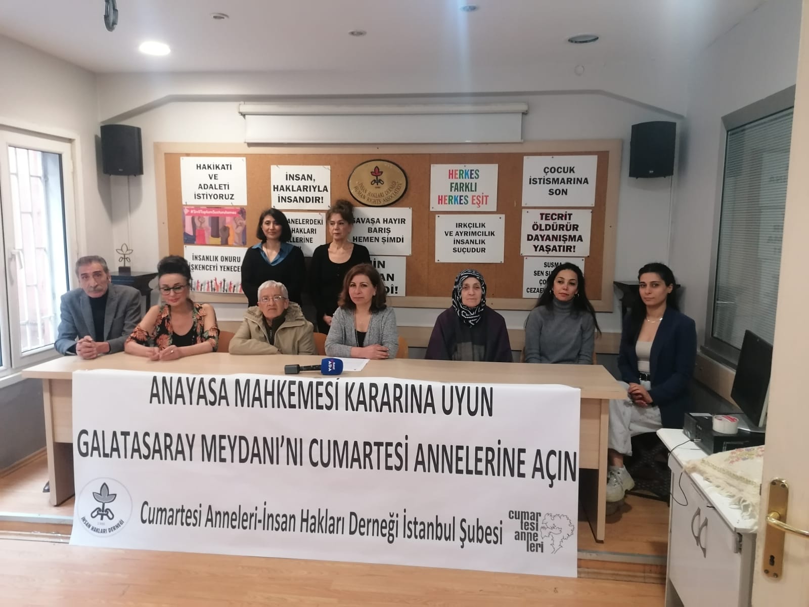 Cumartesi Anneleri, İHD İstanbul Şubesinde “Anayasa Mahkemesi kararına uyun, Galatasaray Meydanı’nı Cumartesi Anneleri’ne açın” diyerek bir basın açıklaması yaptı