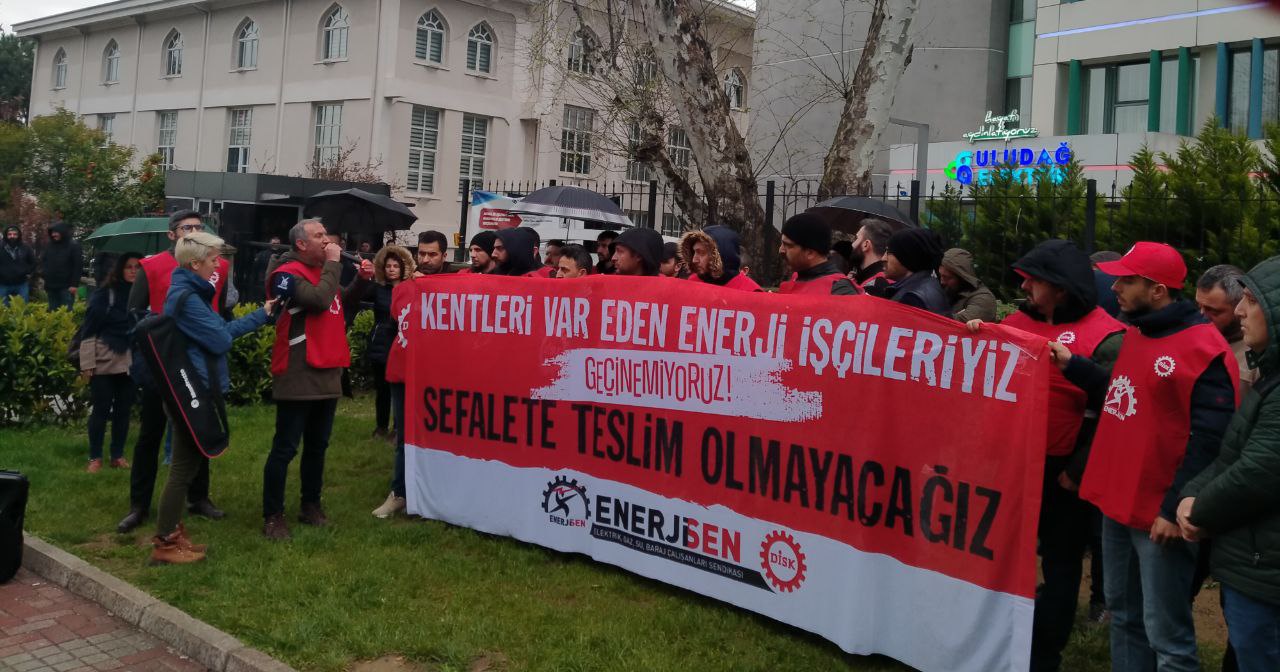 Bursa’da yoğun yağışa rağmen yürüyüşle şirketin Merinos’taki Genel Merkezi önüne yürüyen işçiler “Sefalete teslim olmayacağız” dedi. DİSK/Enerji-Sen Genel Başkanı Süleyman Keskin, şirket önünde yaptığı açıklamada şirket yönetiminin sendikayla işçilerin arasını açmak için işçilere yalan söylediğini ifade etti. Görüşmelerin sendika tarafından ‘yokuşa sürüldüğü’ yalanını her yerde anlatacaklarını söyleyen Keskin, şunları söyledi: