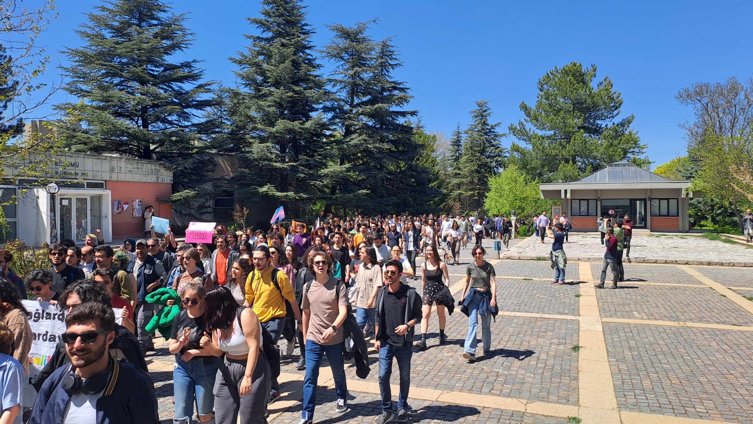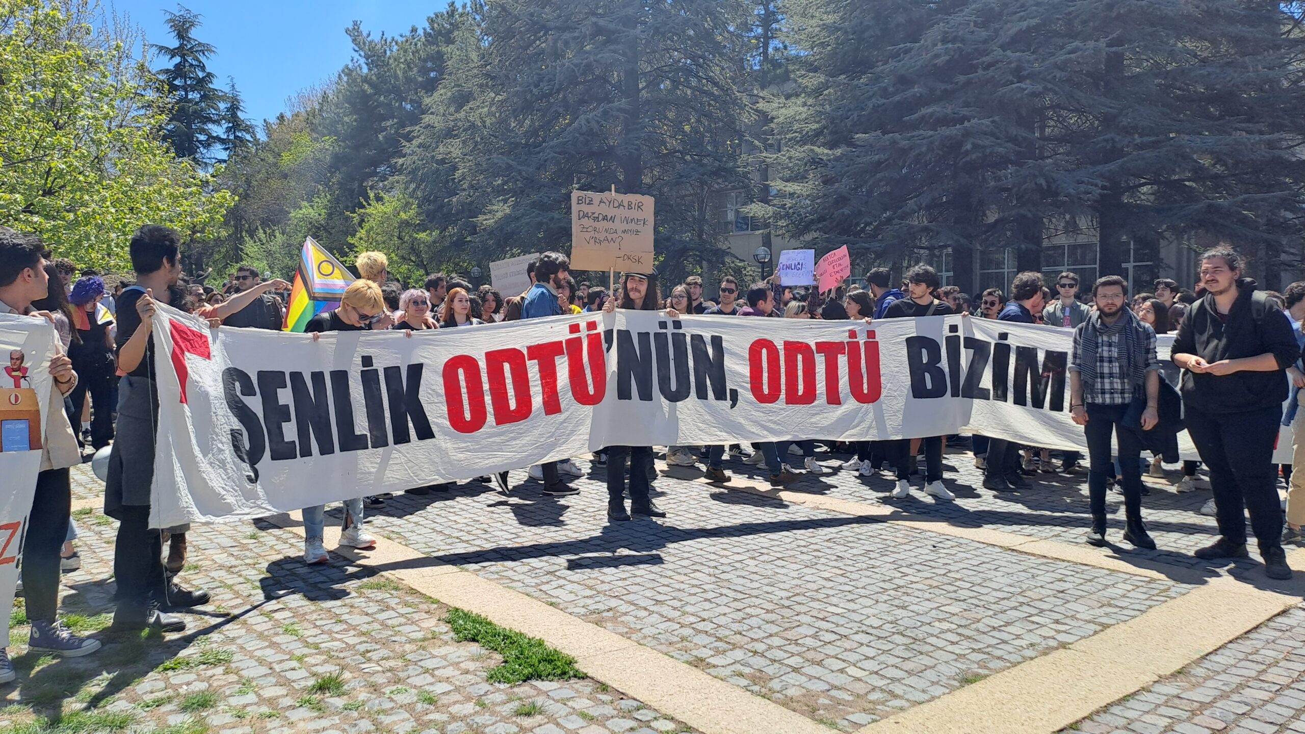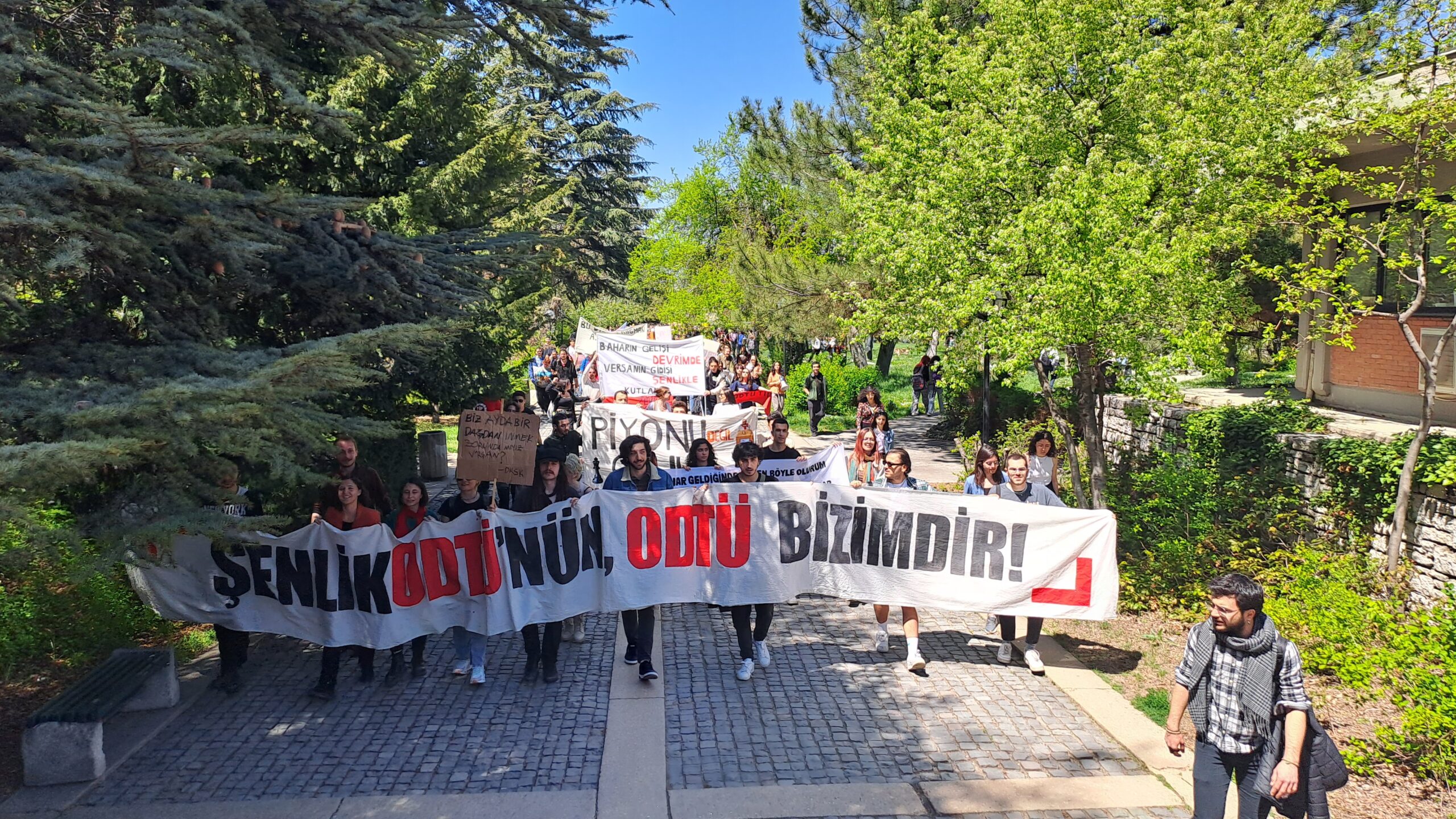 Fizik çimlerinde toplanan ODTÜ’lüler hazırladıkları dövizler ve pankartlarla eyleme eyleme başladı. ‘ODTÜ burada, Verşan nerede?’, ‘Verşan Kök ODTÜ’ye rektör olamaz’ sloganlarını sıklıkla atan ODTÜ’lüler şenliklerinden vazgeçmeyeceklerini ve kayyum rektör Verşan Kök’ün yasaklarını tanımadıklarını ilan ettiler.