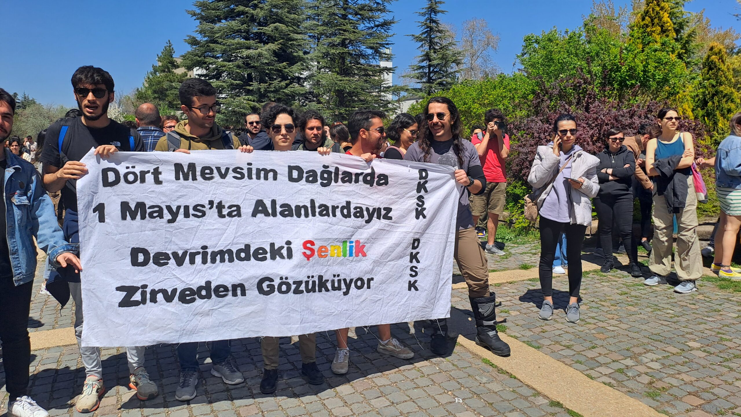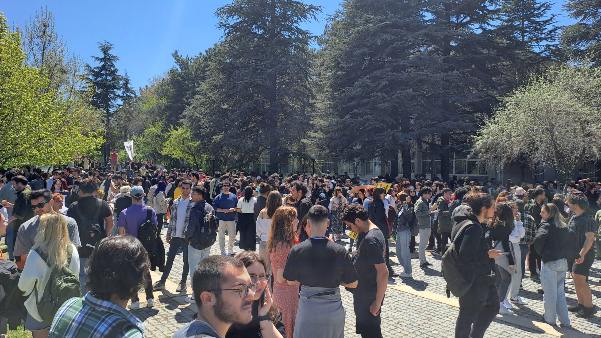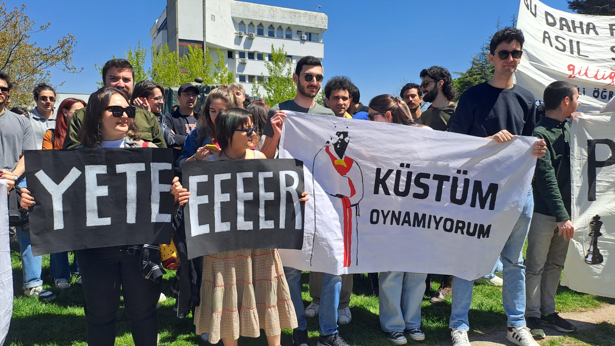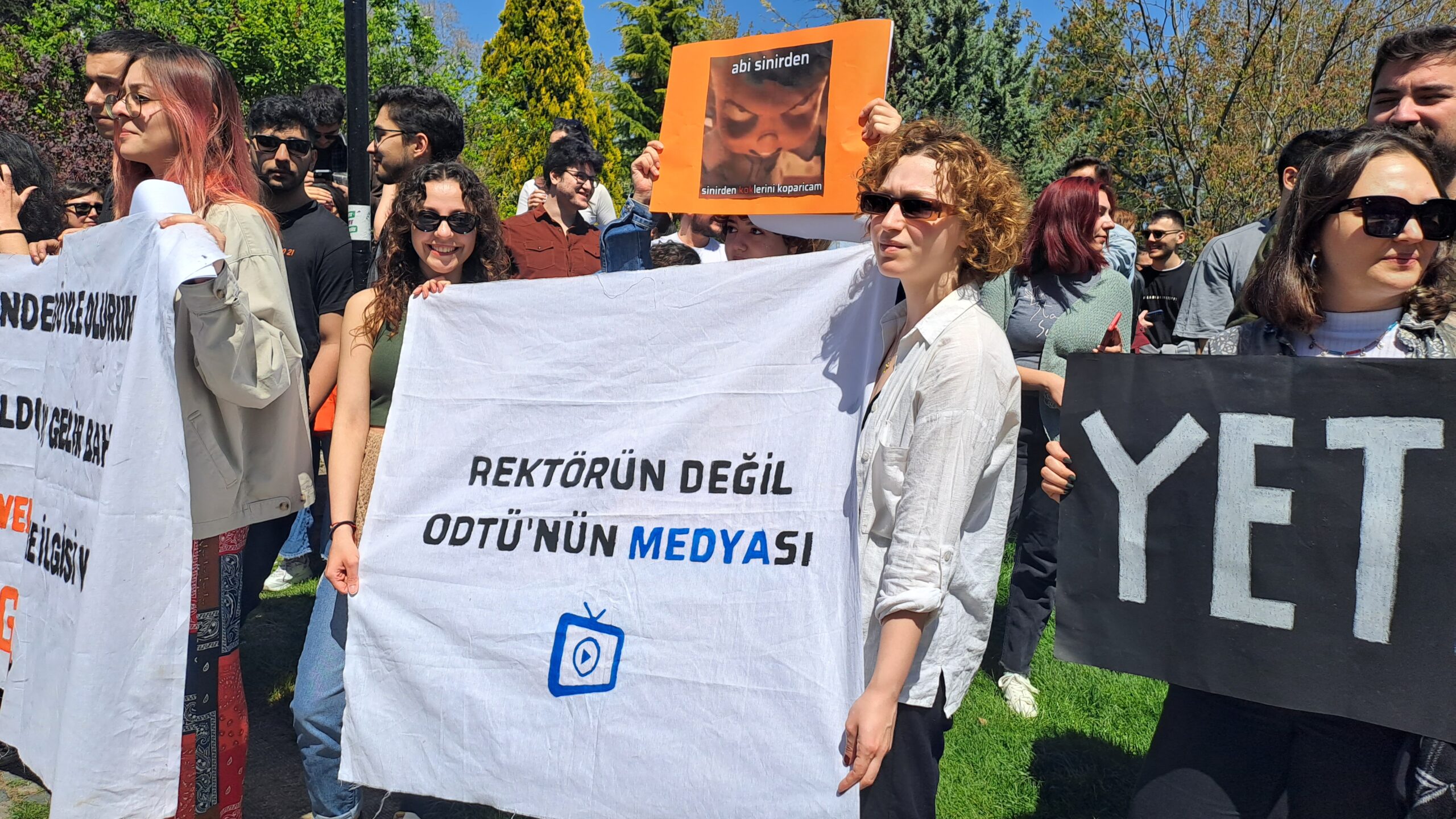Fizik çimlerinde toplanan ODTÜ’lüler hazırladıkları dövizler ve pankartlarla eyleme eyleme başladı. ‘ODTÜ burada, Verşan nerede?’, ‘Verşan Kök ODTÜ’ye rektör olamaz’ sloganlarını sıklıkla atan ODTÜ’lüler şenliklerinden vazgeçmeyeceklerini ve kayyum rektör Verşan Kök’ün yasaklarını tanımadıklarını ilan ettiler.