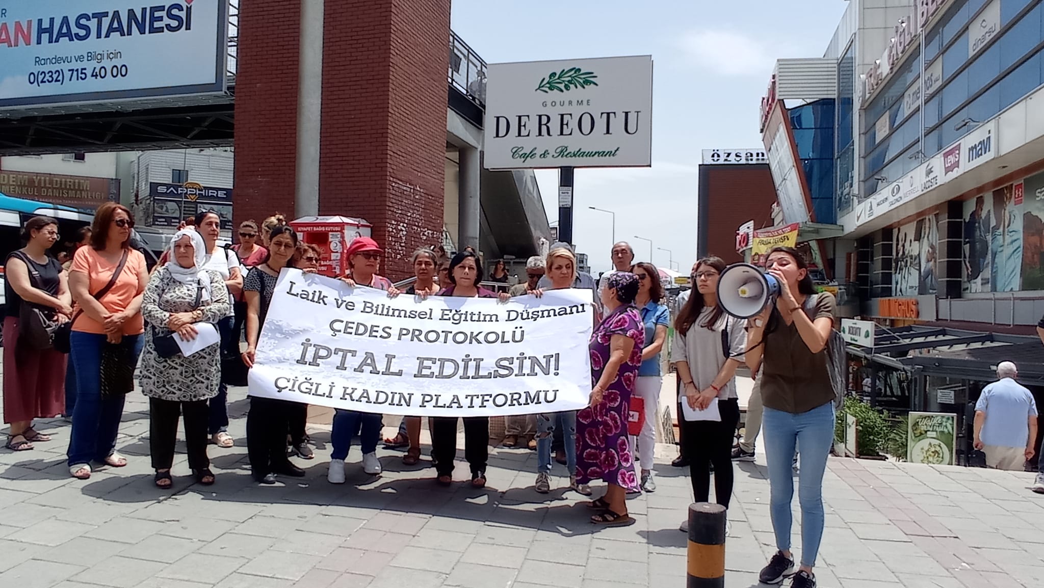 Çiğli Kadın Platformu’nun çağrısıyla saat 12.30’da Çiğli Belediyesi yanında bir araya gelenler “Laik ve bilimsel eğitim düşmanı ÇEDES protokolü iptal edilsin” yazılı pankart açtı.