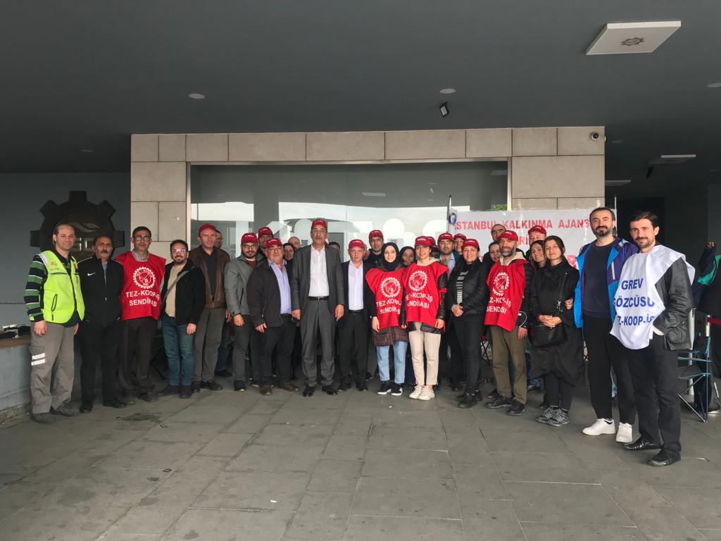 Tez Koop-İş Sendikası’nda örgütlü bulunan İstanbul Kalkınma Ajansı çalışanları, 2022 yılının Aralık ayında başlayan toplu iş sözleşmesi görüşmelerinin beşinci ayında, işveren sendikası Yerel-Sen’in İstanbul Kalkınma Ajansı çalışanları için büyük hak kayıpları yaratan teklifine karşı anayasal haklarını kullanarak 8 Mayıs tarihinde greve çıktı.