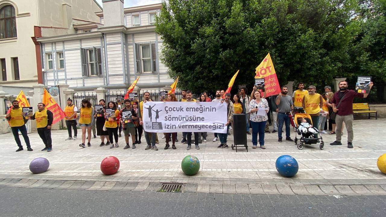 “Çocuk emeğinin sömürüsüne izin vermeyeceğiz” yazılı pankartla açıklama yapan TÖP, “Çocuklarla ilgili her şey politik ve sınıfsaldır, biliyoruz” dedi.