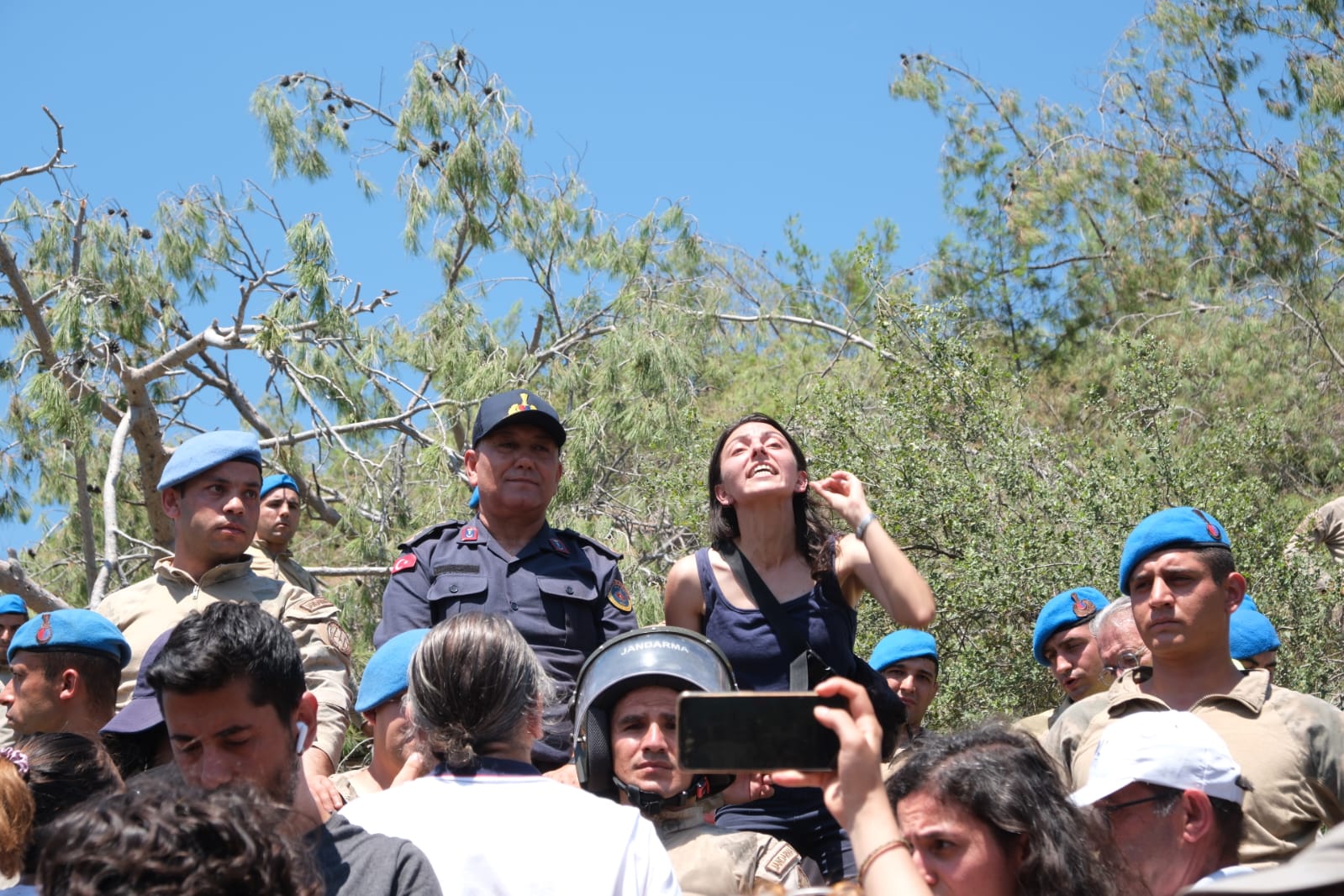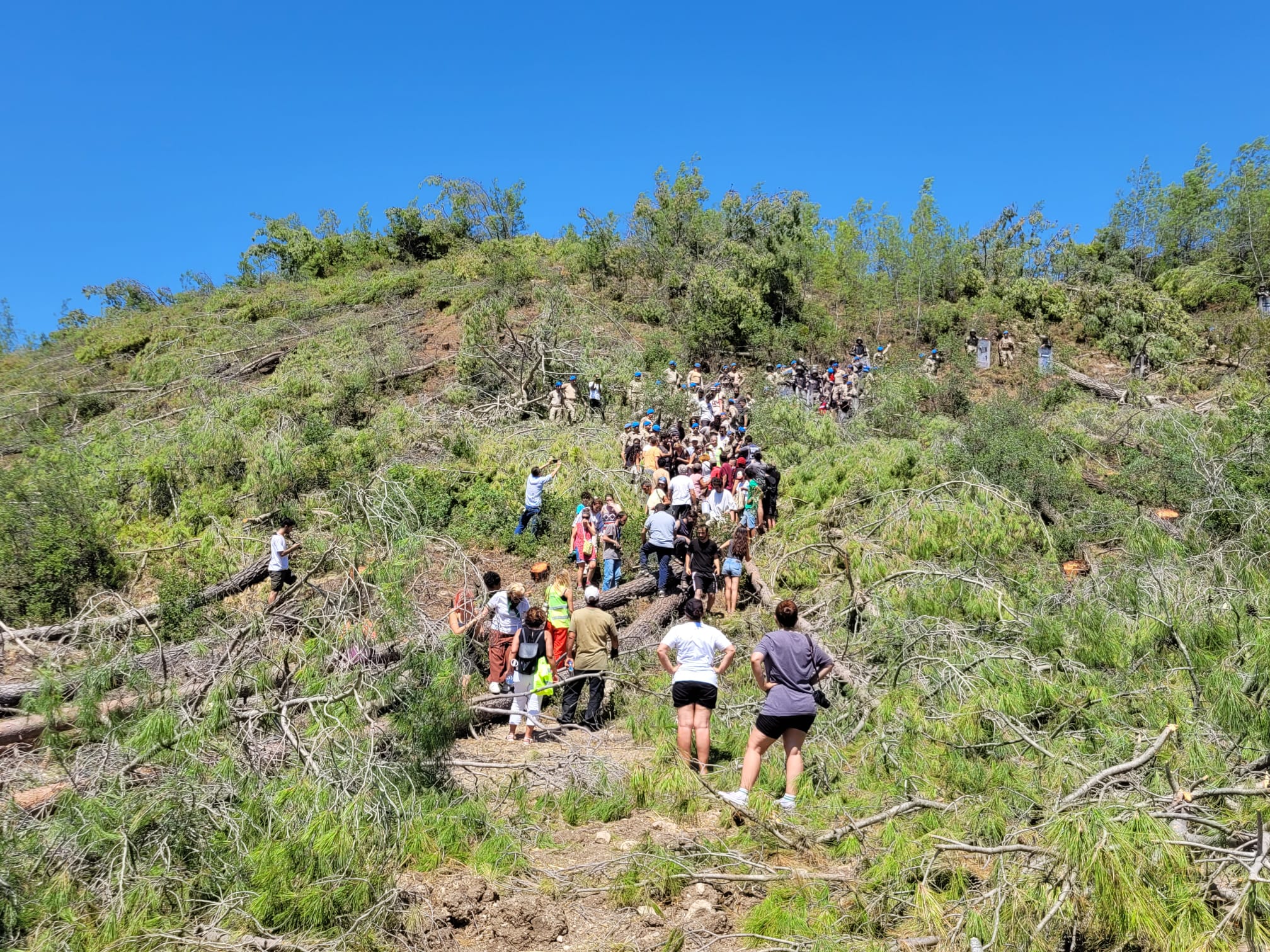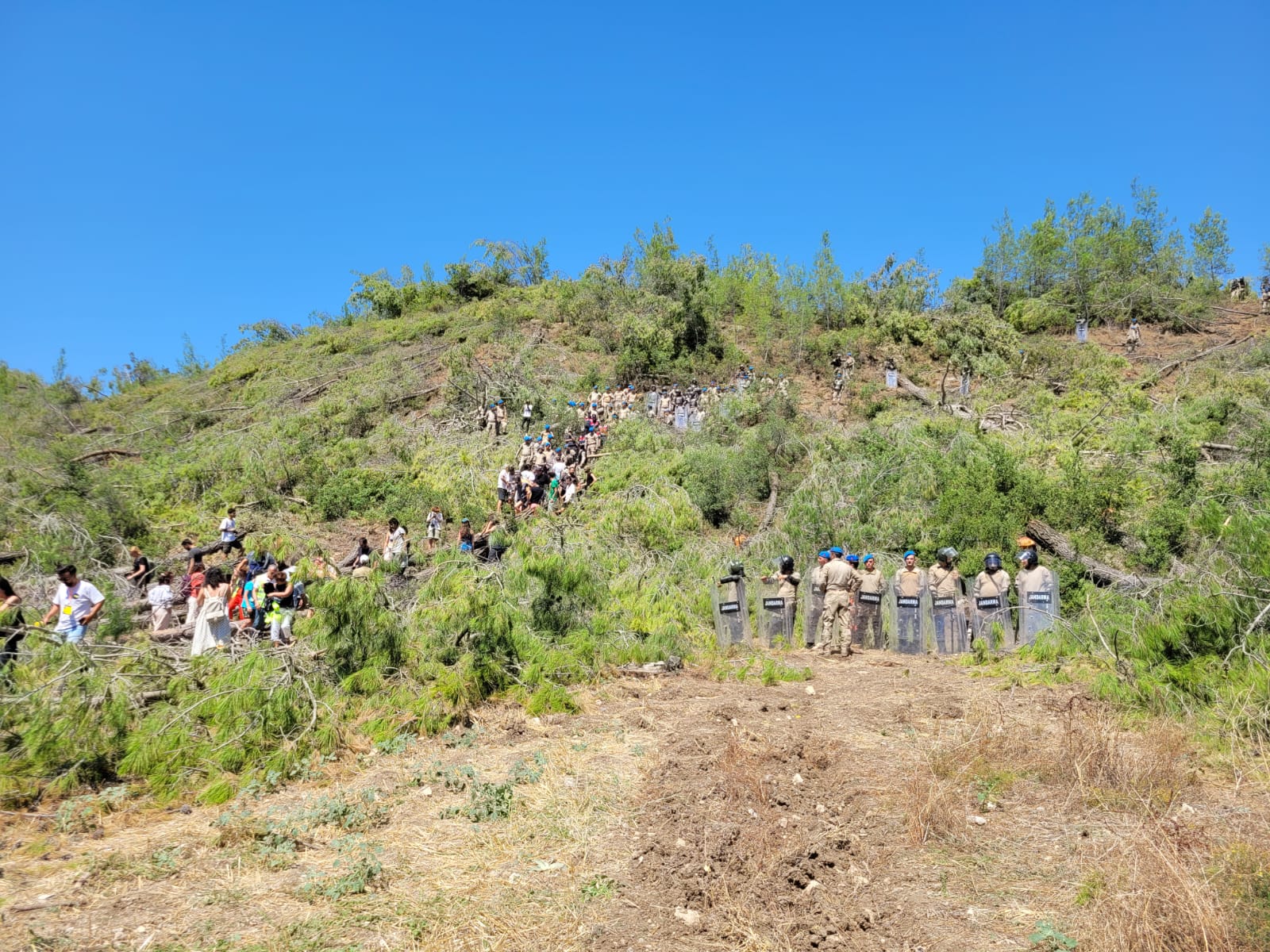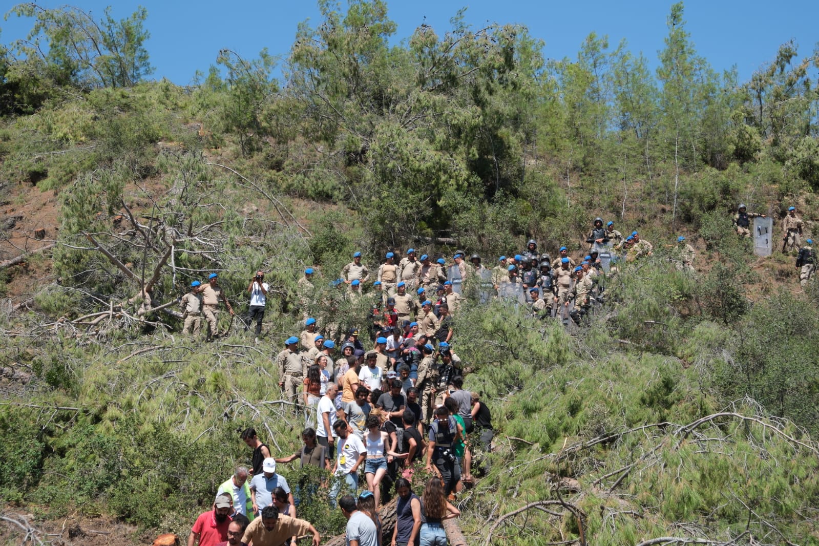 Kesime karşı nöbet tutulan alanın tepesinde bulunan bölgede ağaçlar kesildi. Yurttaşlar, bunun üzerine kesim yapılan alana yöneldi. “Akbelen’den Cudi’ye yeryüzüne özgürlük”, “Katil Limak işbirlikçi devlet” ve “Limak’tan hesabı halk soracak” sloganlarıyla yürüyen yurttaşların önü askerler tarafından kesildi.