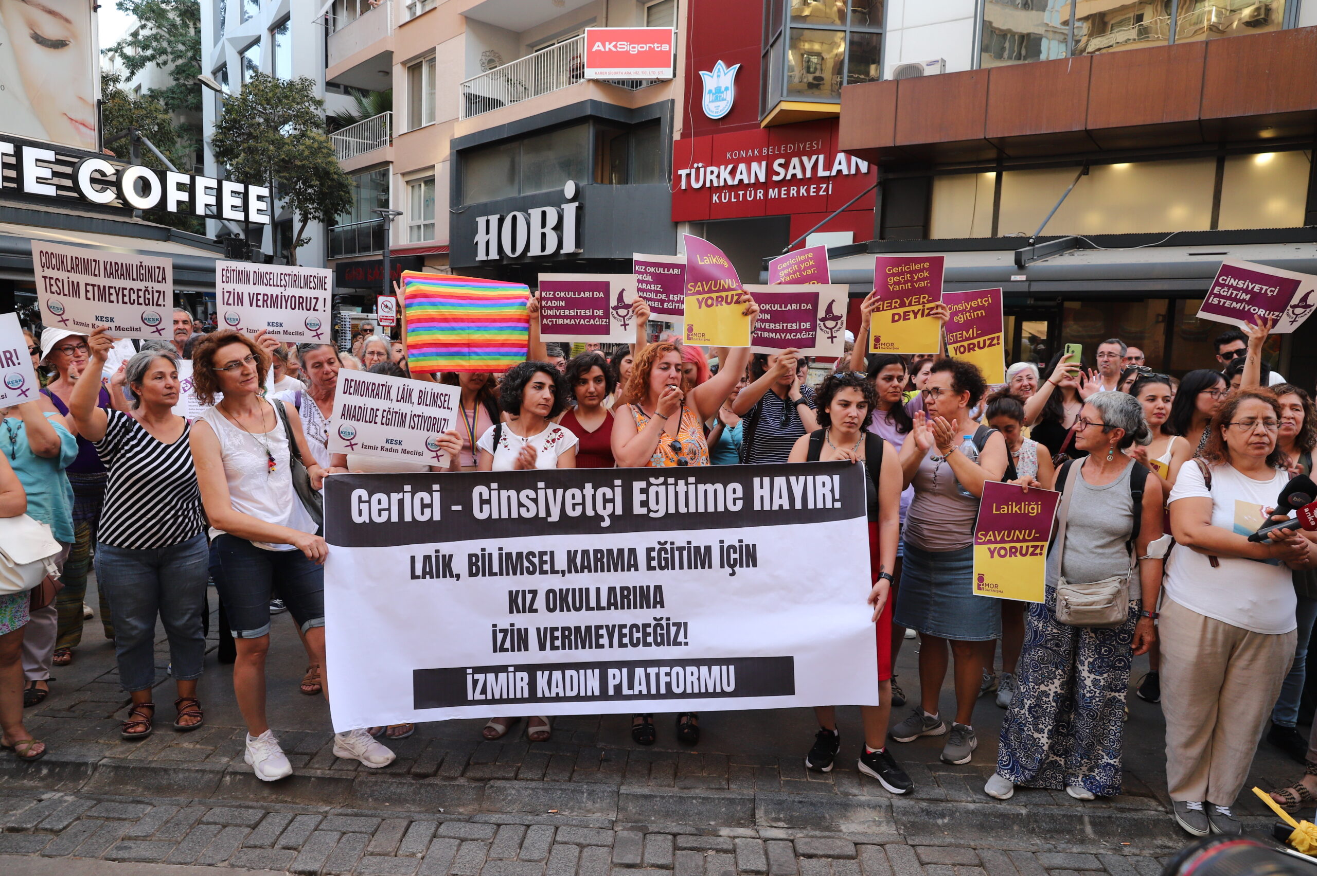 İzmir Kadın Platformu, kız çocuklarının okullaşmasını artırmak bahanesiyle karma eğitime son verilmesine, eğitim sisteminin dini kuralara göre biçimlendirilmesine tepki gösterdi