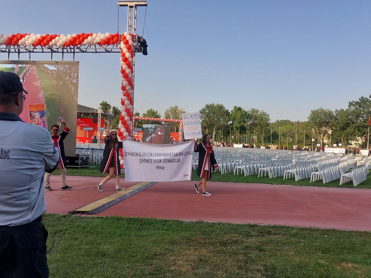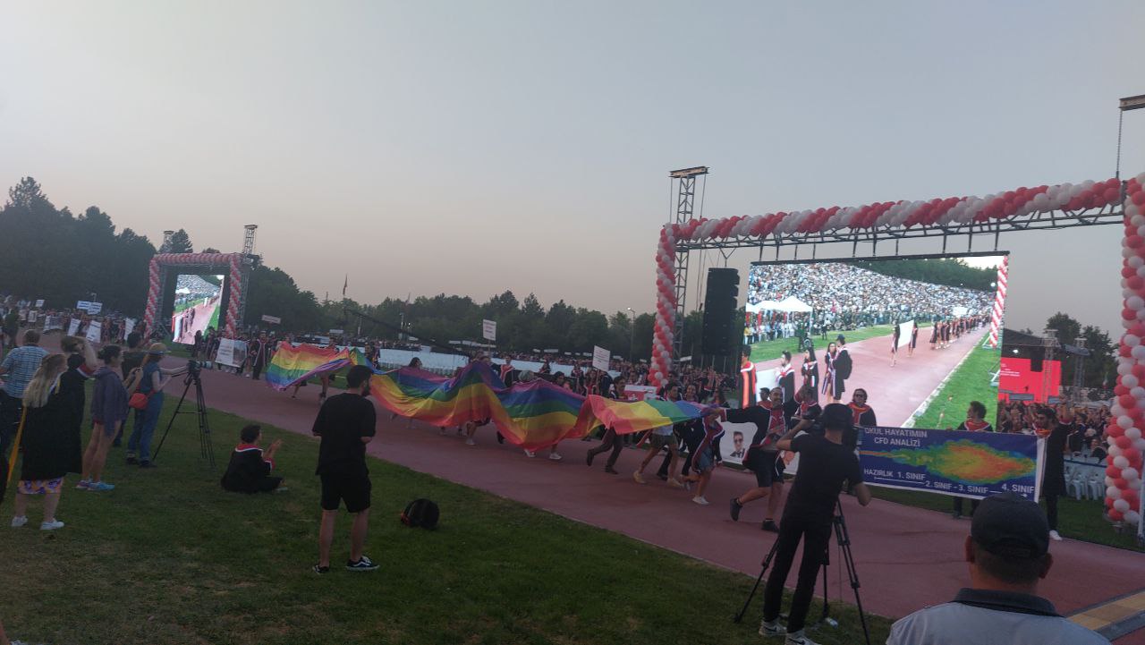 Kapıda polislerin ve özel güvenliklerin kurduğu alanda mezunların gökkuşağı bayrakları engellenmeye çalışılsa da stadyumdan görülecek şekilde yurt binasına dev bir bayrak asıldı. Bunun yanı sıra yürüyüş pistine çıkan dev gökkuşağı bayrağı da geleneği bozmayarak mezuniyet töreninde yerini bir kere daha aldı.