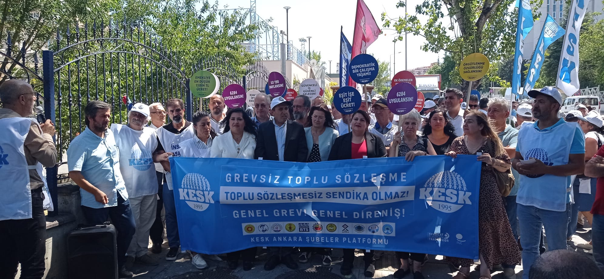 Kamu toplu sözleşme görüşmelerinin son oturumu öncesinde Çalışma Bakanlığı’na girecek heyeti uğurlayan KESK üye ve yöneticileri bakanlık önünde basın açıklaması yaparak taleplerini yineledi. Eyleme KESK yöneticilerinin yanı sıra TTB Genel Sekreteri Vedat Bulut ve CHP İşçi Sendikaları, STK ve Meslek Kuruluşlarından Sorumlu Genel Başkan Yardımcısı Hasan Efe Uyar da katıldı.