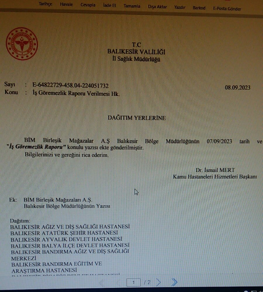 BİM tarafından Balıkesir İl Sağlık Müdürlüğü’ne “İş göremezlik raporu” konulu bir yazı gönderildi.