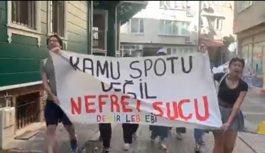 Kadıköy’de “Kamu spotu değil, nefret suçu” yazılı pankartı açarak yürüyen Demir Leblebi, “Saraylarında yaşamlarımıza göz dikenler bilsin ki Hande Kader’e Ahmet Yıldız’a sözümüz var, onların öfkesi ile mücadelemiz devam edecek!” dedi.
