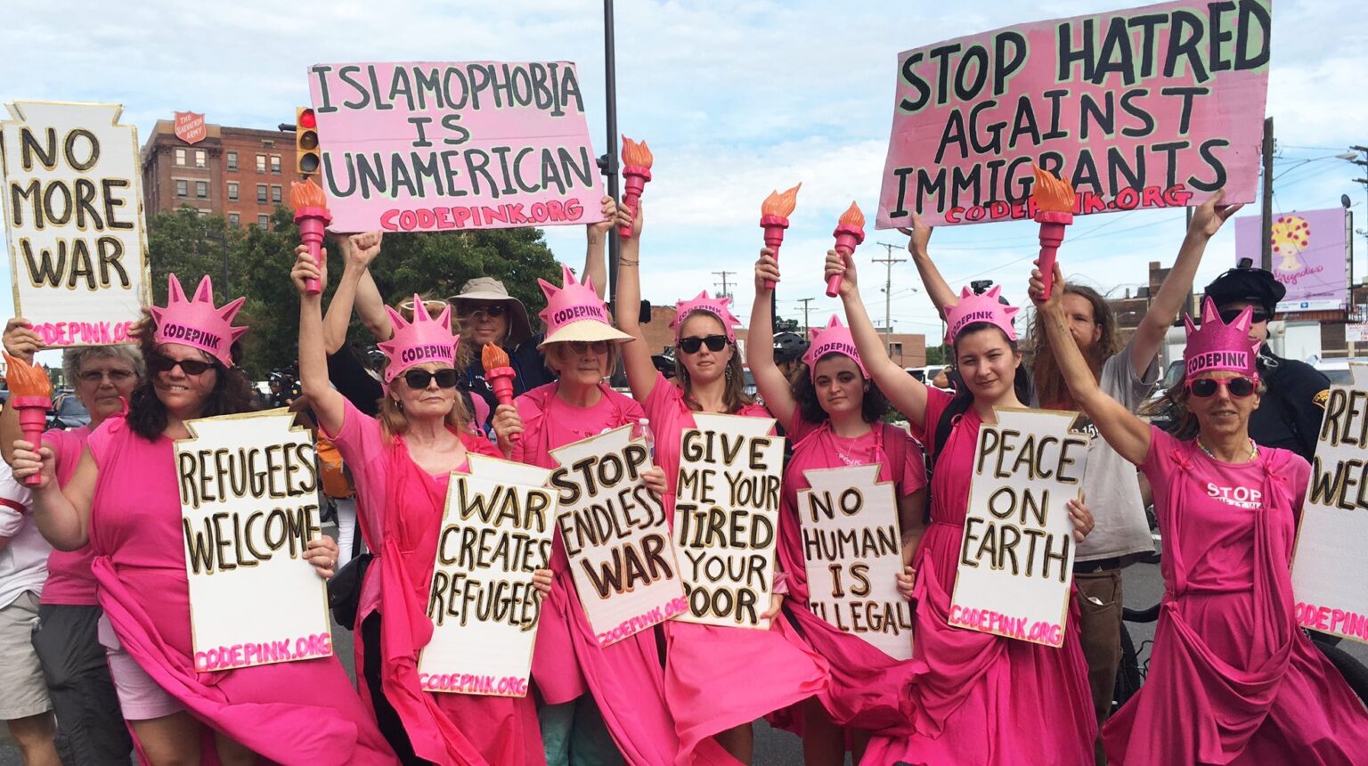örgütün “pembe kod” anlamına gelen adı, bush yönetiminin renk kodlu -sarı, turuncu, kırmızı- güvenlik alarmı uyarılarına gönderme. codepink halen ırak’ta adalet ve savaş suçlarının yargılanması, guantanamo’daki işkence ve gözaltı merkezinin kapatılması için, silahlı ve casus insansız uçaklara, abd’nin israil’e ve başka gerici rejimlere verdiği desteğe karşı mücadele yürütüyor.