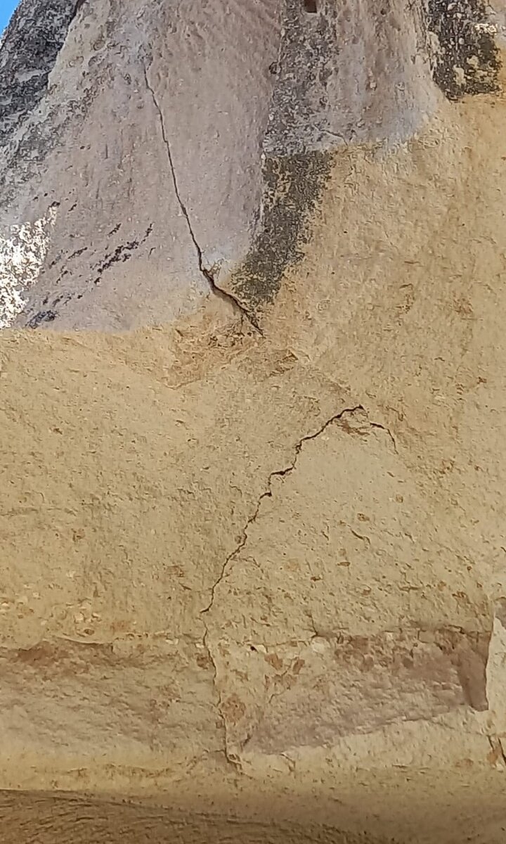 Kapadokya’da ağır iş makineleriyle tarih ve kültür katliamı yapılan bölgede, tahribat büyüyor. Ortahisar-Göreme yolunun kullanımı ve genişletilmesi nedeniyle çok sayıda peri bacası, şapel ve manastır yok olmak üzere. Temsilcilerimiz bölgede an be an süreci takip ediyor görselliyor. Fotoğraflar ve videolarda pek çok peri bacasında derin çatlakların oluştuğu apaçık görülüyor. Ortahisar-Göreme yolunun Göreme müze yolu kavşağına yakın noktasındaki manastır yerleşkesi içinde yer alan yemekhanede de yeni çatlaklar oluşmuş durumda. Ayrıca, yemekhanenin dışına yazılar yazılarak jeolojik oluşumlara ciddi zararlar verilmiş, yol inşaatı sırasında çevredeki alanlara dökülen ve üzeri toprakla örtülerek gizlenmeye çalışan hafriyat, üzerindeki toprak gidince tekrar görünür olmaya başlamış durumda. Yol çevresi hızla kirletilmiş, etrafa atılan çöpler, dolu çöp kutularının ise boşaltılmaması Unesco Dünya Miras listesi bir bölgeye yakışmadığı gibi, yetkililerin görevlerini de tam anlamıyla yapmadığını ortaya çıkartıyor. Yol güzergâhındaki kaya birimi volkanik kül, tüfit türü, gevşek malzeme olduğundan, eğimini azaltmak için derine kazı yapılması nedeniyle şevde göçmeler-kaymalar yaşanıyor. Yolun kendisinde de kırılmalar olmuş, şiddetli yağmur yağdığında dökülen hafriyatlar vadilere akıyor, Şev göçmesini önlemek için geriye doğru zeminde sıyrılma işlemi yapıldığından yolun genişliği planlanandan çok daha geniş olacağı çok açık. Dört şeritli olan yolun verdiği tahribatın büyüklüğü ortada. Ağır iş makinalarının yarattığı titreşim, tur otobüsleri ve ağır tonajlı tırlar geçtikçe çatlaklı yapılardaki peribacalarının yıkılma süreci hızlanacaktır. Yol kullanımı acilen durdurulmalıdır.