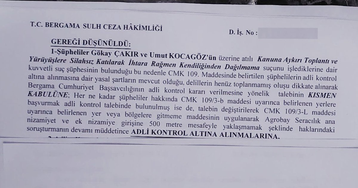 Bergama Cumhuriyet Başsavcılığı karara gerekçe olarak kişilerin üzerlerine atılı “Kanuna Aykırı Toplantı ve Yürüyüşlere Silahsız Katılarak İhtara Rağmen Kendiliğinden Dağılmama” suçunu işlediklerine dair kuvvetli suç şüphesi bulunduğunu gösterdi. Başsavcılık bu nedenle kişilerin adli kontrol altına alınmasına dair yasal şartların mevcut olduğuna ve Karacagöz ve Çakır’a Agrobay Seracılık ana nizamiyet ve ek nizamiye girişine 500 metre mesafeyle yaklaşmamak şeklinde soruşturmanın devamı müddetince adli kontrol altına alınmalarına karar verdi.