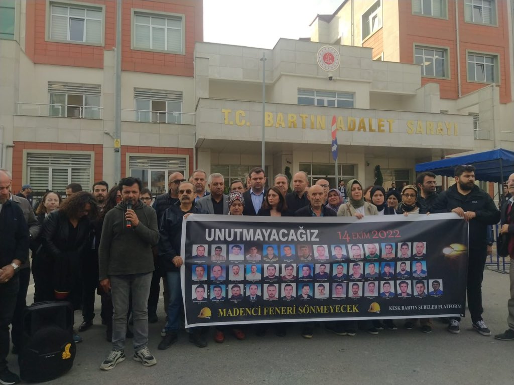 7’si tutuklu 23 sanığın yargılandığı dava öncesinde adliye önünde aileler, avukatlar, milletvekilleri ve sendikaların temsilcileri açıklama yaptı. Dava avukatlarından Diren Cevahir Şen, adaletin sağlanması için mücadele ettiklerini ifade ederken Bartın halkına da davayı takip etmeye çağırdı. “Bu dava hepimizin davası” diyen Şen, ihmaller zincirinin açığa çıkarılması ve TTK Genel Müdürlük ve bakanlık düzeyindeki sorumluların da yargılanması için de mücadele ettiklerini belirtti.