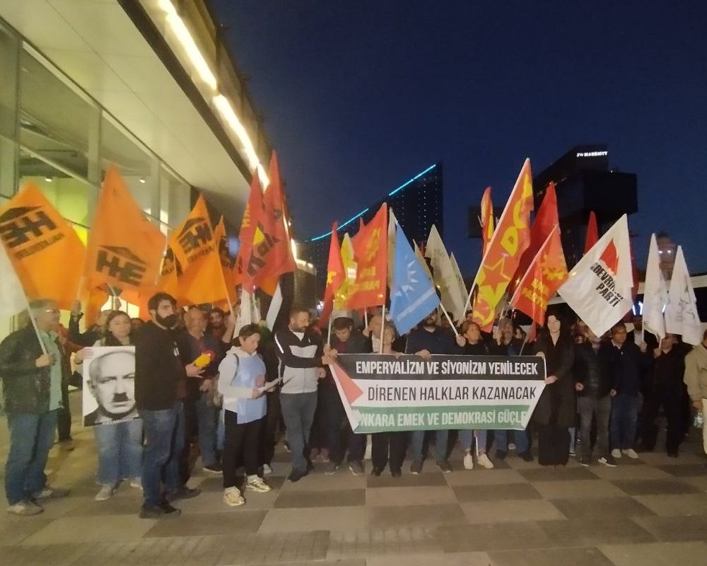 Ankara Emek ve Demokrasi Güçleri, İsrail’in saldırılarına karşı Filistin halkı ile dayanışma için İsrail Büyükelçiliği önünde “Emperyalizm ve siyonizm yenilecek, direnen halklar kazanacak!” diyerek eylem yaptı