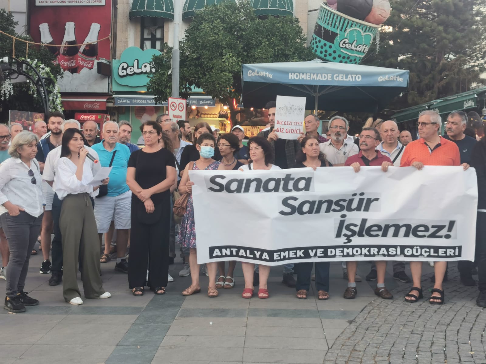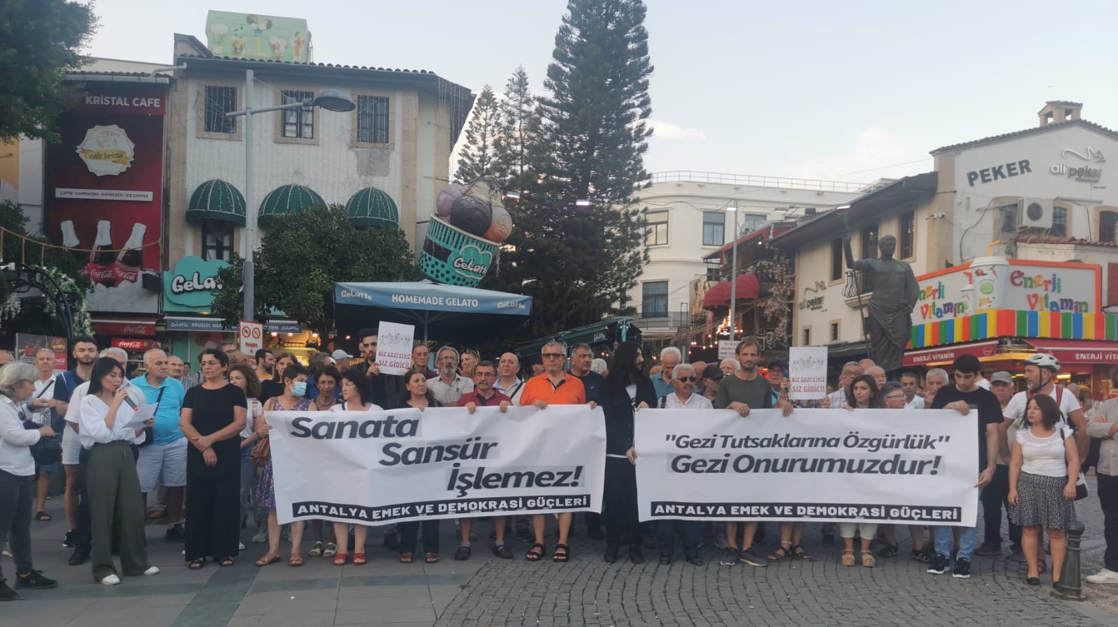 Antalya Emek ve Demokrasi Güçleri, Attalos Meydanı’nda bir araya gelerek Gezi Davası kararı ve Altın Portakal’a ilişkin bir basın açıklaması yaptı