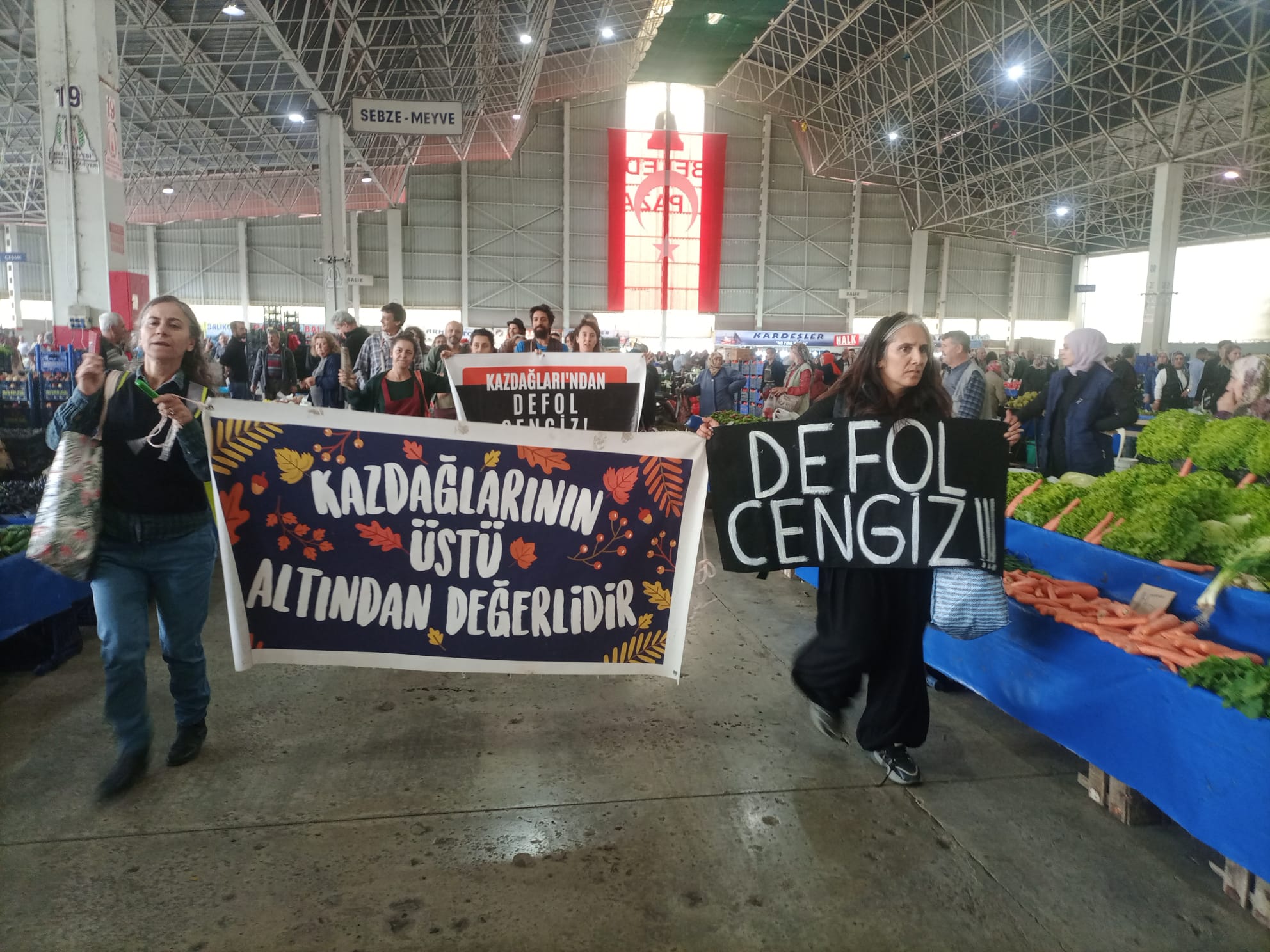 Açılan pankartlarda “Madene verecek suyumuz yok”, “Defol Cengiz”, “Kazdağları’ndan defol Cengiz”, “Kazdağları’nın üstü altından değerlidir” ifadeleri yer aldı.