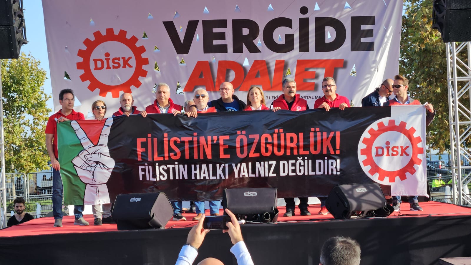 Mitingde Filistin’e de selam gönderildi. DİSK Yönetim Kurulu üyeleri sahneye “Filistin’e özgürlük! Filistin halkı yalnız değildir” yazılı pankartla çıktı. İşçiler “Katil İsrail Ortadoğu’dan defol” sloganı attı.