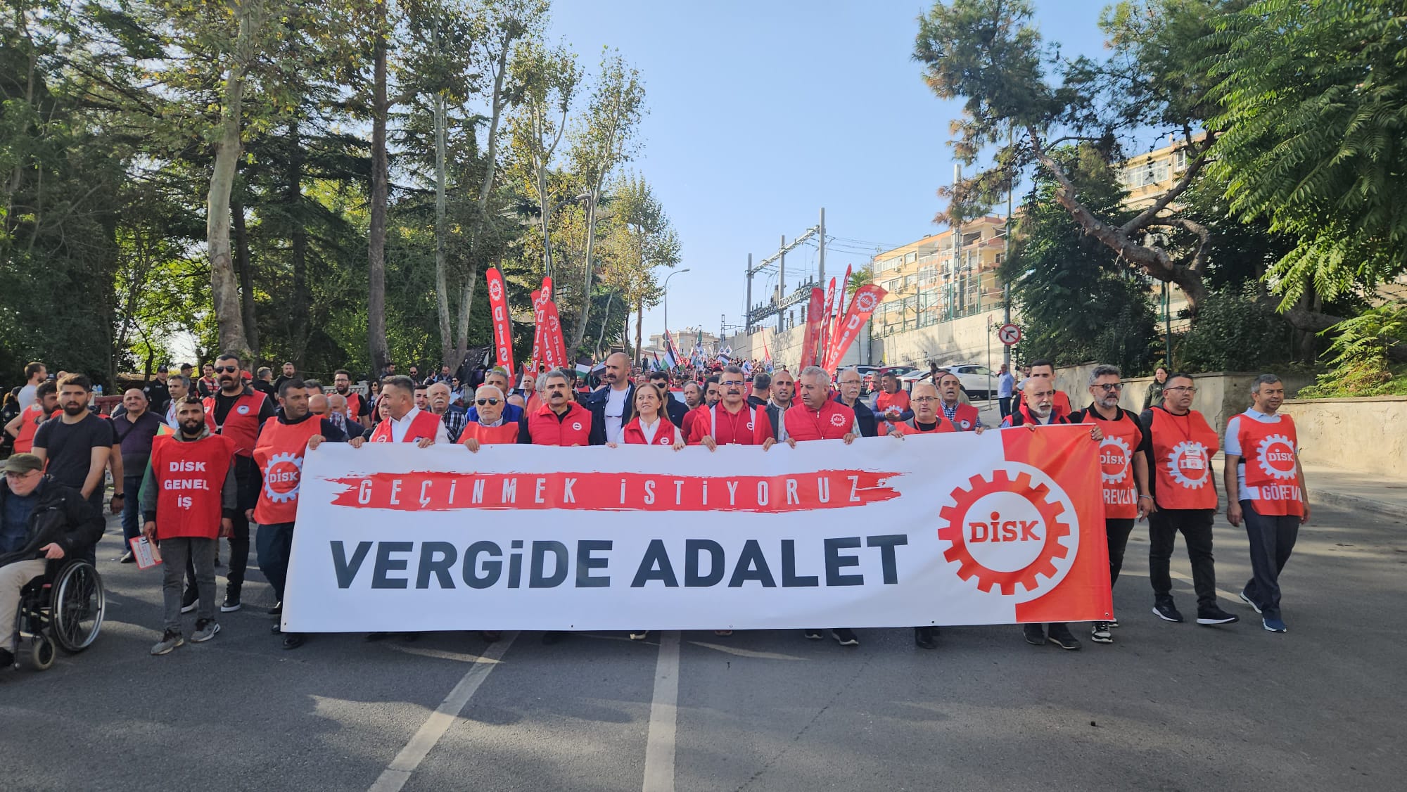 Türkiye’deki adaletsiz vergi sistemine karşı Devrimci İşçi Sendikaları Konfederasyonu’nun (DİSK) çağrısıyla Kartal’da bir araya gelen işçiler vergi dilimlerinin işçilerin lehine düzenlenmesini, az kazanandan az çok kazanandan çok vergi alınmasını istedi.