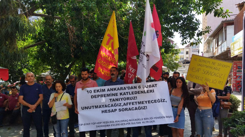 DİSK, KESK, TMMOB ve TTB’nin çağrısıyla Hatay toplumsal muhalefet güçleri 10 Ekim katliamında yaşamını yitirenleri andı. Eğitim Sen Hatay Şubesi Başkanı Özgür Tıraş’ın okuduğu basın açıklamasında dava sürecinde katliamın sorumlularına dokunulmadığı vurgulanarak adalet talebi yinelendi.