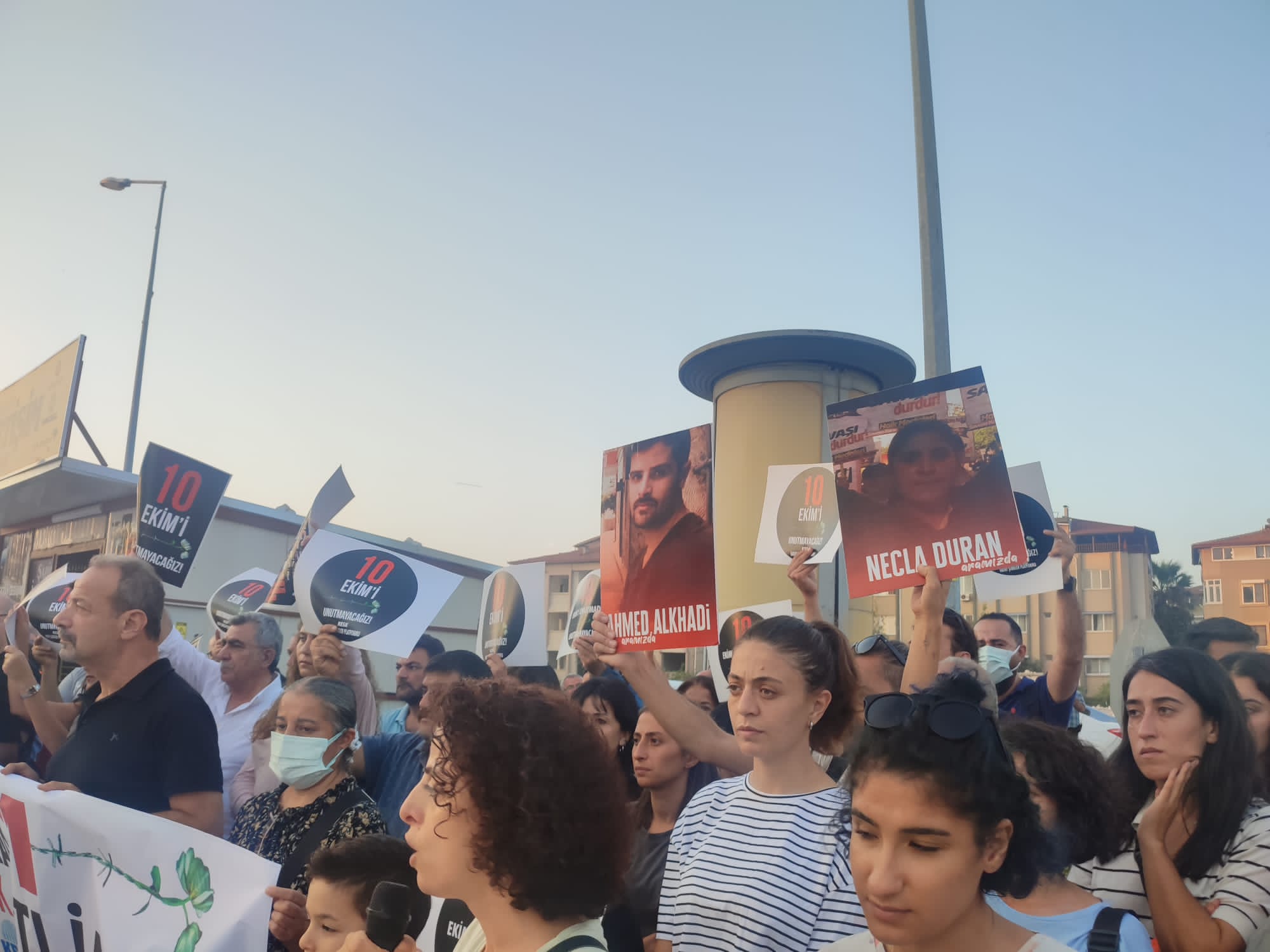 Kitle basın açıklaması sırasında sık sık “10 Ekim’i unutma unutturma”, “Unutmak yok, affetmek yok, helalleşmek yok”, “Savaşa hayır, barış hemen şimdi”sloganlarını attı. Eylemde 10 Ekim’de yaşamını yitiren Hatay Halkevi üyeleri Necla Duran ve Ahmed el Khaldi’nin fotoğrafları taşındı.