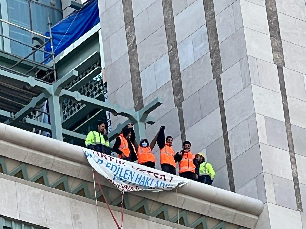 Limak Holding’in haklarını gasp etmesine karşı başlattıkları direnişin 7. gününde olan işçiler Merkez Bankası Şantiyesi 5. katını işgal etti. İşçiler, haklarını alana kadar direnmeye devam edeceklerini söyledi