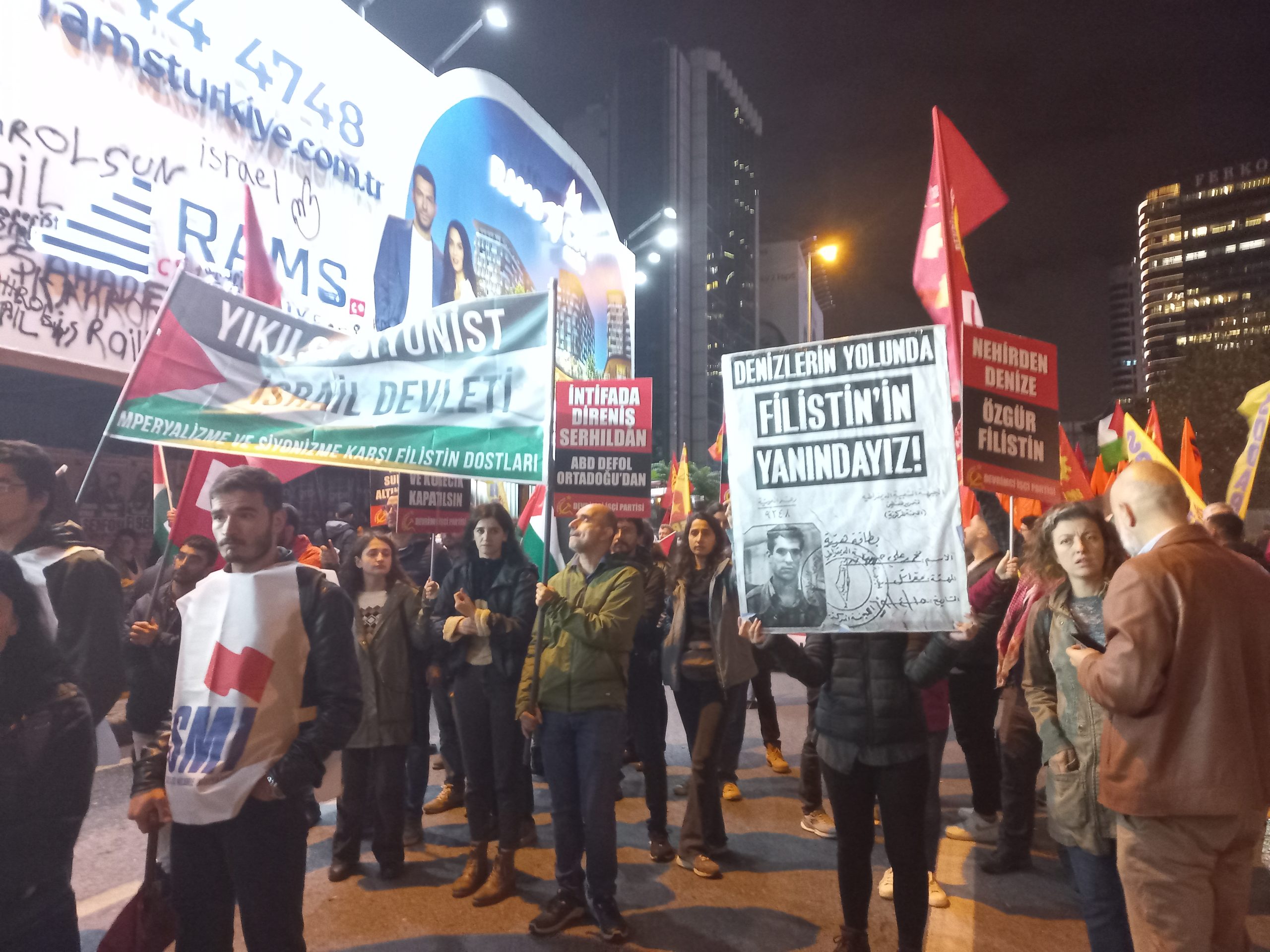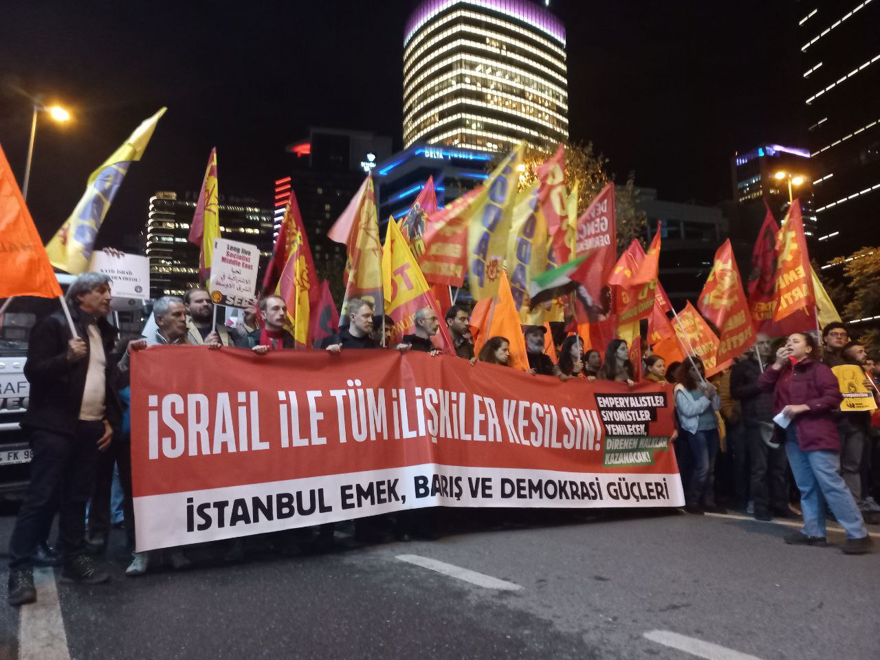 İstanbul Emek, Barış ve Demokrasi Güçleri’nin çağrısıyla Levent’te bulunan plazalar önünde bir araya gelen yüzlerce kişi sloganlarla İsrail Konsolosluğu önüne yürüyüşe geçti. Kadınlar Birlikte Güçlü de yürüyüş kortejine dahil oldu.