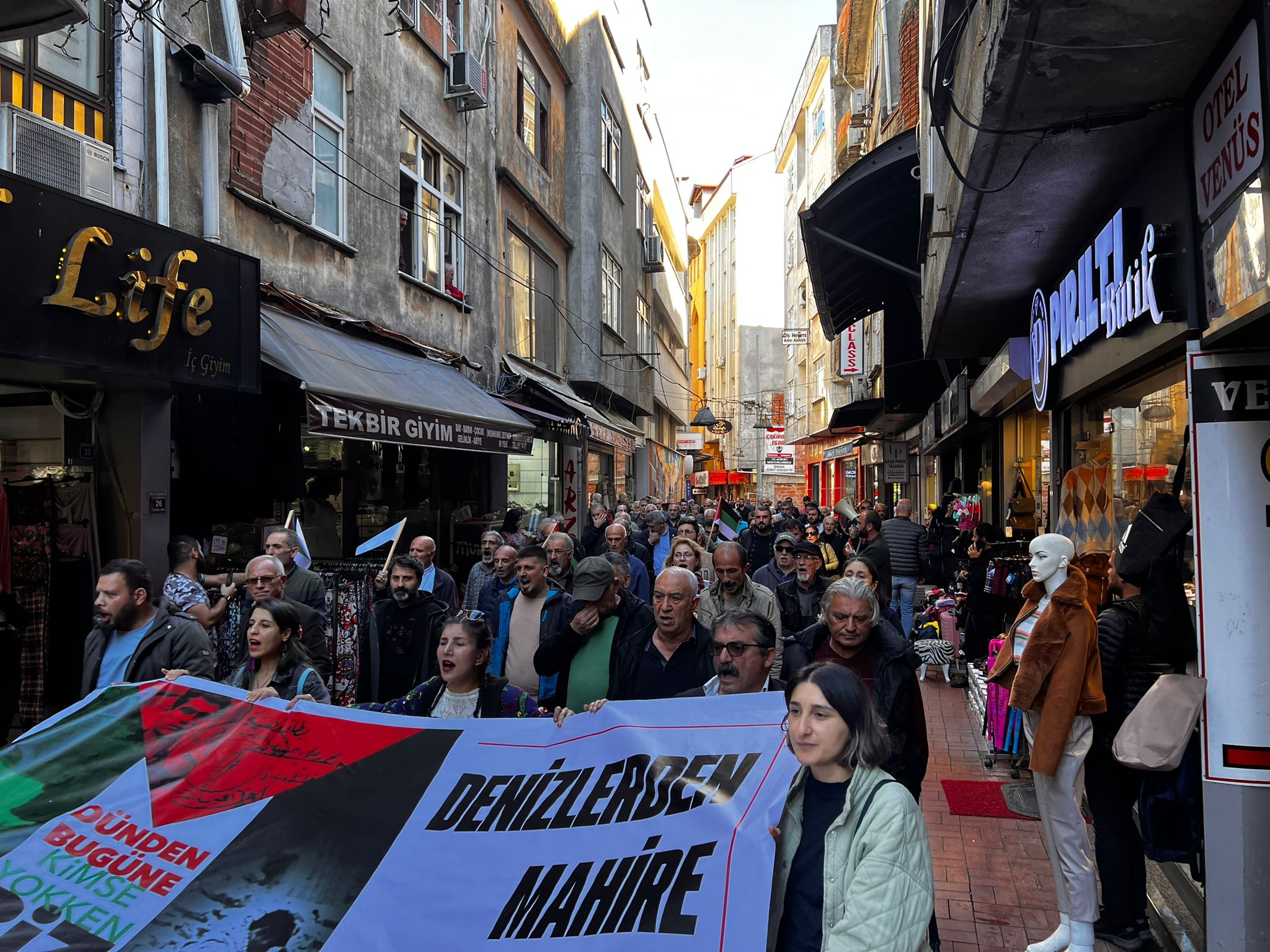 Bugün (20 Ekim) saat 12.30’da Hopa Parkı’nda bir araya gelen yurttaşlar buradan “Denizlerden Mahire Filistin’e bin selam” pankartı arkasında Hopa Meydanı’na yürüdü.
