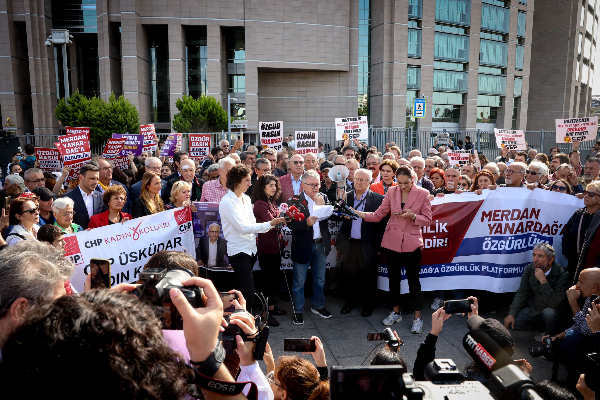 Duruşma öncesinde adliye önünde toplananlar, Merdan Yanardağ’ın serbest bırakılması talebiyle basın açıklaması yaptı. Açıklamaya çok sayıda kurum destek verdi.