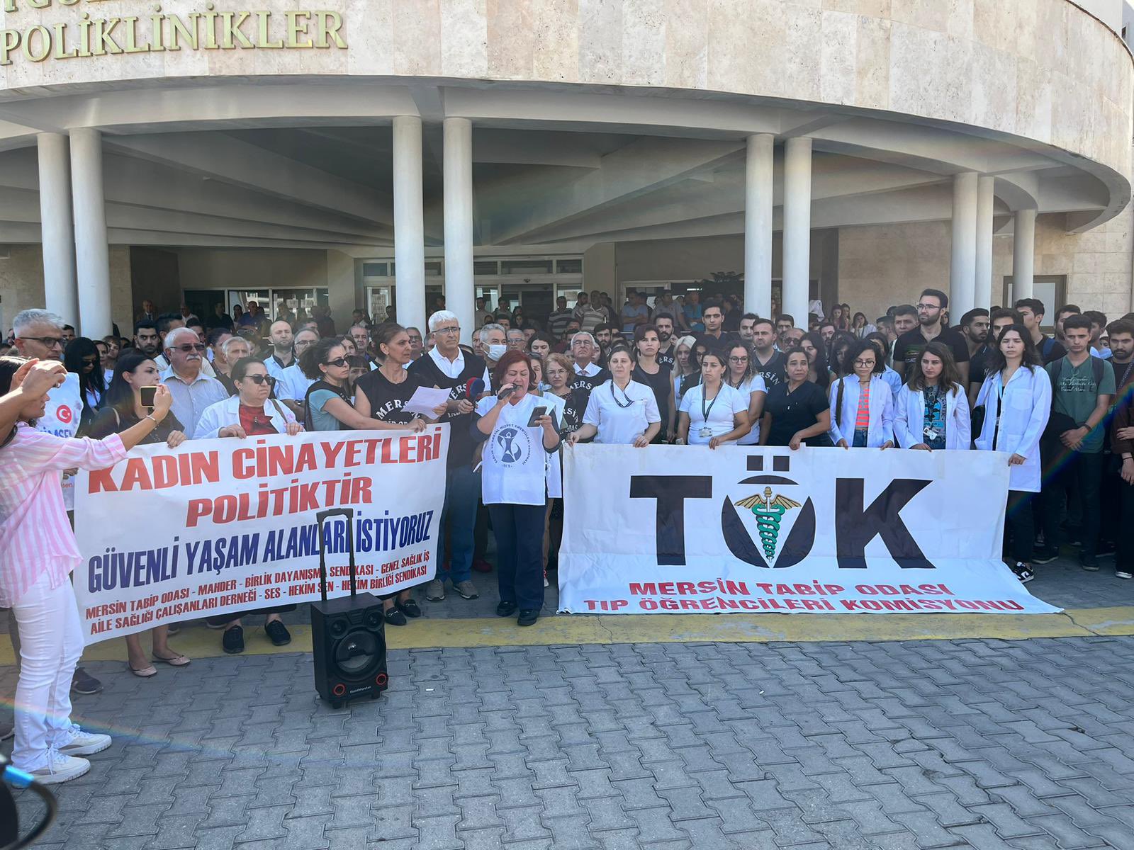 Mersin Tabip Odası, Mersin Aile Hekimleri Derneği, Birinci Basamak Sağlık Çalışanları Birlik ve Dayanışma Sendikası, Genel Sağlık İş, Aile Sağlığı Çalışanları Derneği, SES, HEKİMSEN ve Hekim Birliği Sendikasının çağrısıyla yapılan açıklamayı Mersin Tabip Odası Yöneticisi Reyhan Baloğlu okudu. “Yaşamak yaşatmak istiyoruz” diyerek kadın katliamlarının durdurulması çağrısı yapan Baloğlu, önceki gün Hemşire Ayfer Kaya’nın uzaklaştırma kararı olan boşanma aşamasında olduğu eşi tarafından hastanenin yanındaki özel otoparkta katledildiğini de hatırlattı.