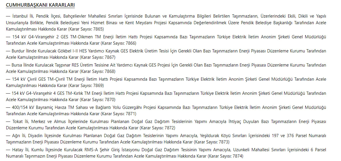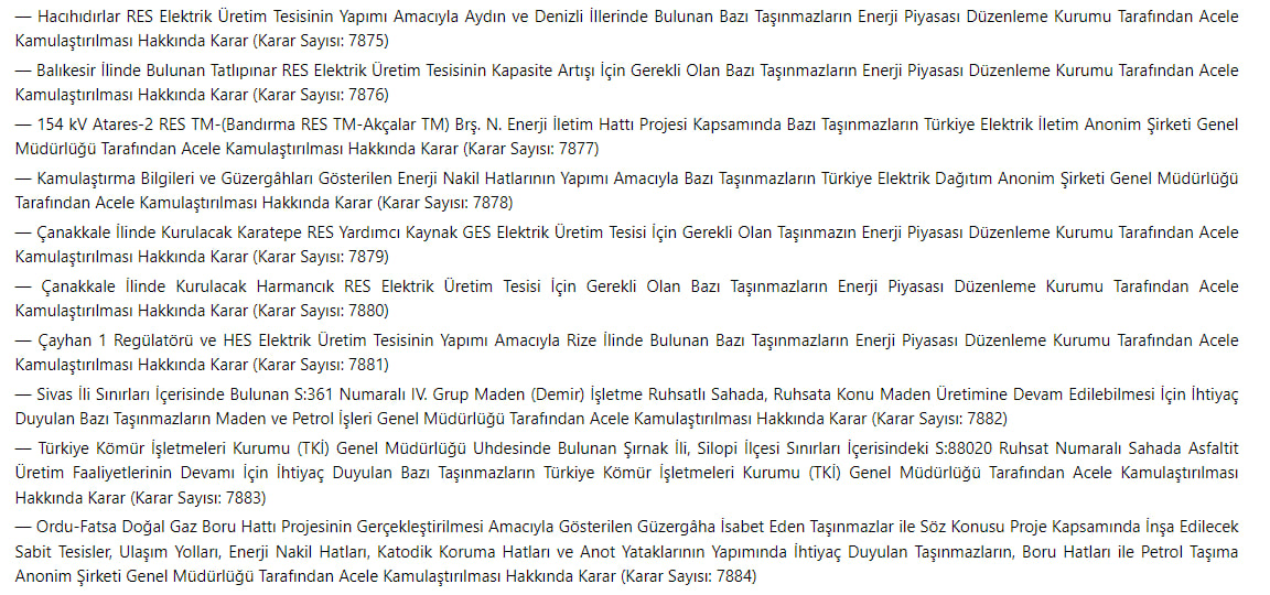16 şehirde 19 noktada Güneş enerji santrali ve rüzgar enerji santrali alanları, doğalgaz dağıtım ve depolama alanları ve enerji iletim ve dağıtım için alanları için taşınmazlar hakkında acele kamulaştırma kararı verildi