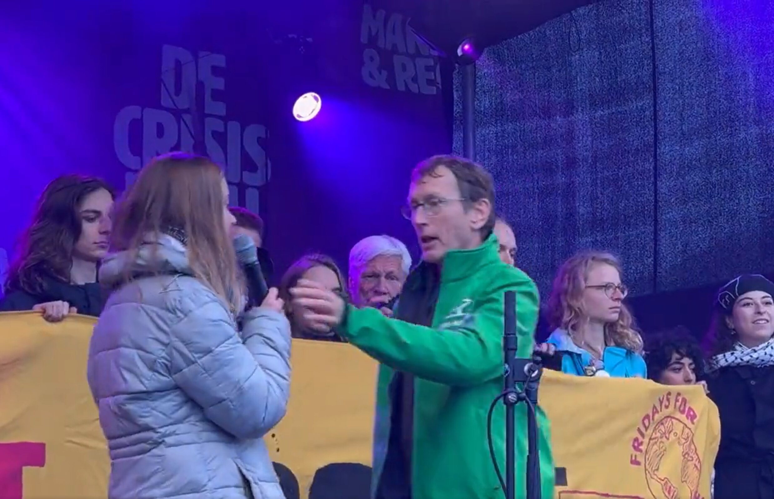 Greta Thunberg’in konuşması sırasında sahneye fırlayan bir kişi Filistin’e destek veren Greta Thunberg’in elinden mikrofonu almaya çalıştı. Sahneye atlayan kişi mikrofonu alıp şunları söyledi:
