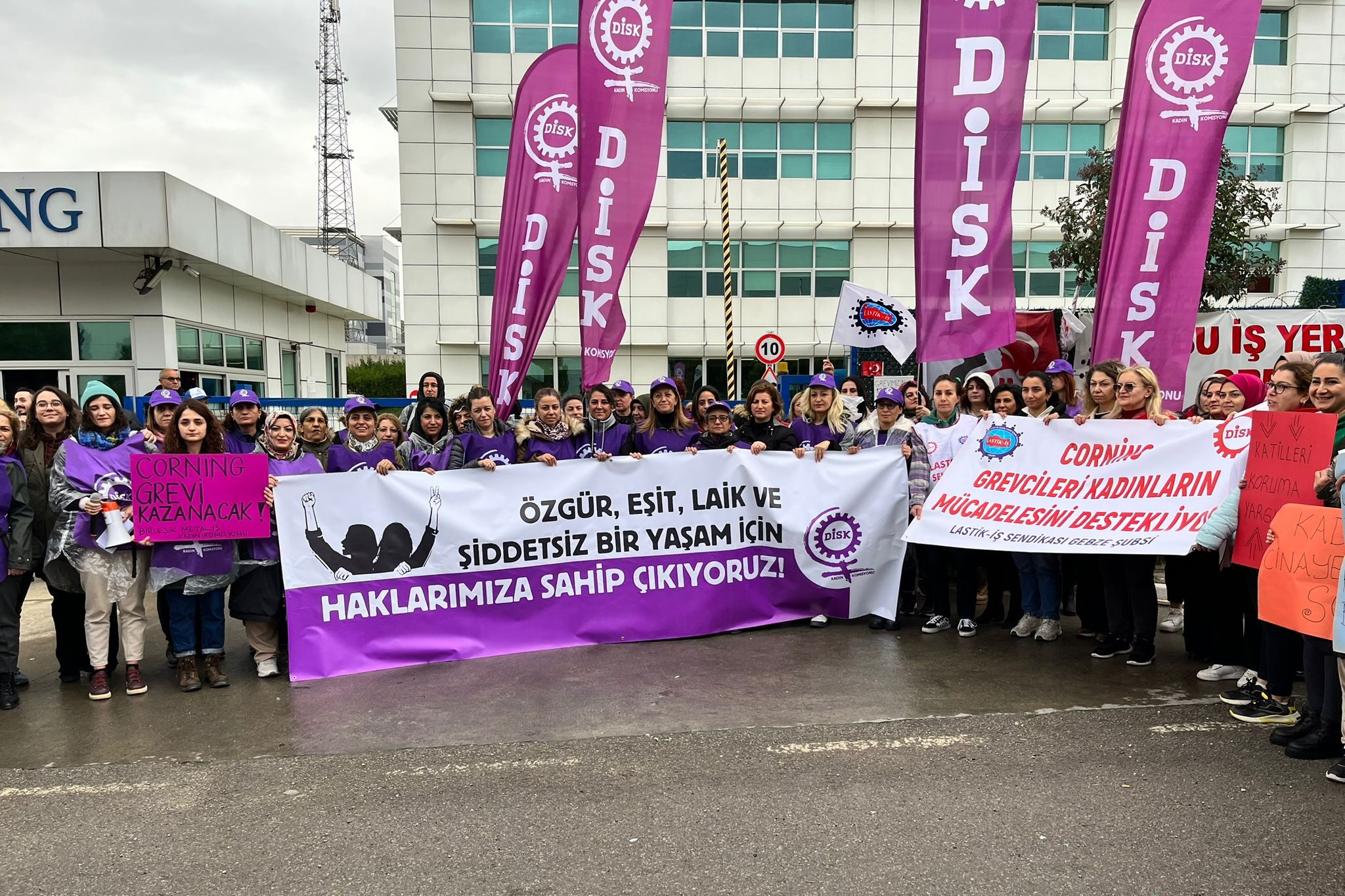 Gebze’de bulunan Corning Kablo işçileri, sendikaları DİSK/Lastik-İş’in öncülüğünde grevde. 25 Kasım Kadına Yönelik Şiddete Karşı Uluslararası Mücadele Günü’nde DİSK Genel Başkanı Arzu Çerkezoğlu grevdeki kadın işçileri ziyaret etti.