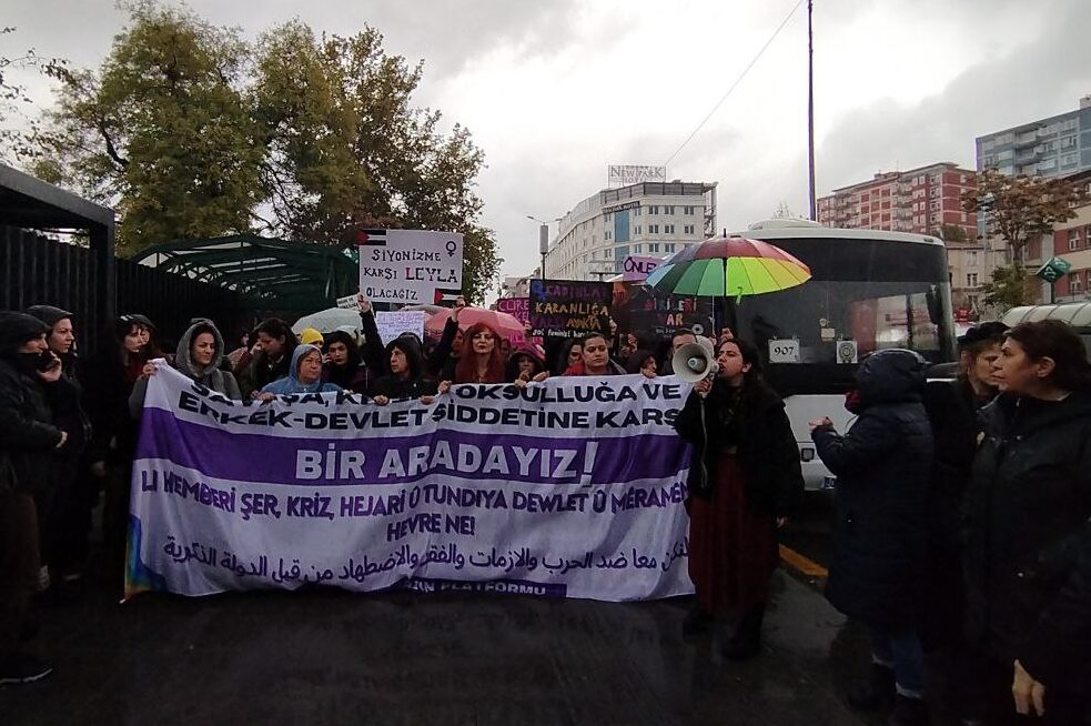 Hemen her eylemde İsrail’in saldırılarına karşı Filistin direnişine de selam gönderildi. Kadınlar Rojava’ya yönelik operasyonların da sonlandırılmasını talep etti.