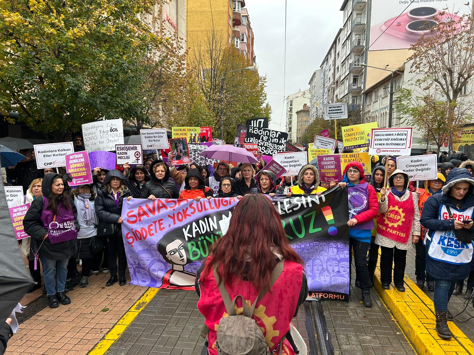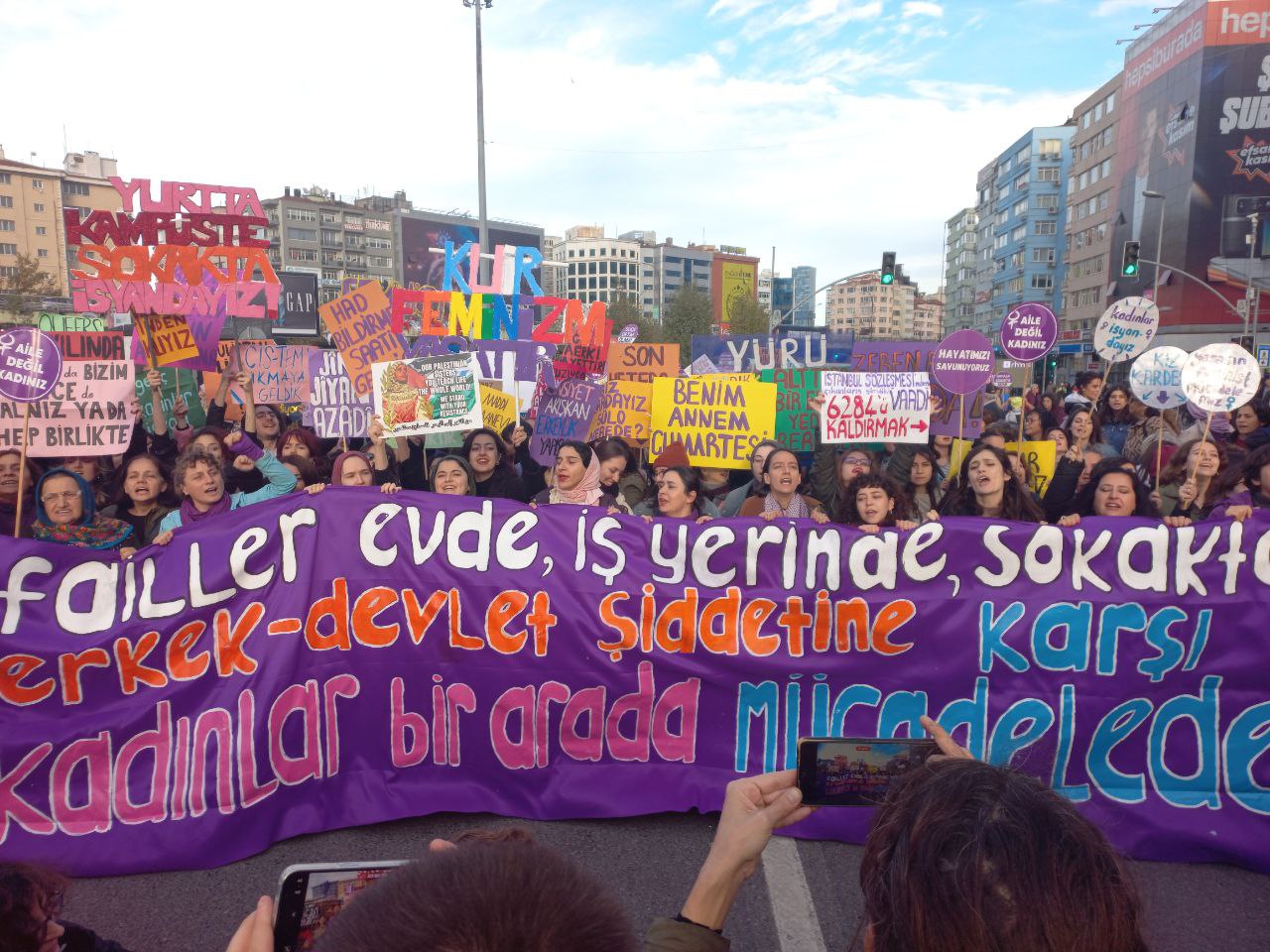 25 Kasım Kadına Yönelik Şiddetle Uluslararası Mücadele Günü’nde kadınlar ve LGBTİ+’lar, Ankara Kadın Platformu’nun “Savaşa, krize yoksulluğa ve erkek-devlet şiddetine karşı bir aradayız” diyerek yaptığı çağrıyla Kolej Meydanı’ndan Sakarya Caddesi’ne yürüdü.