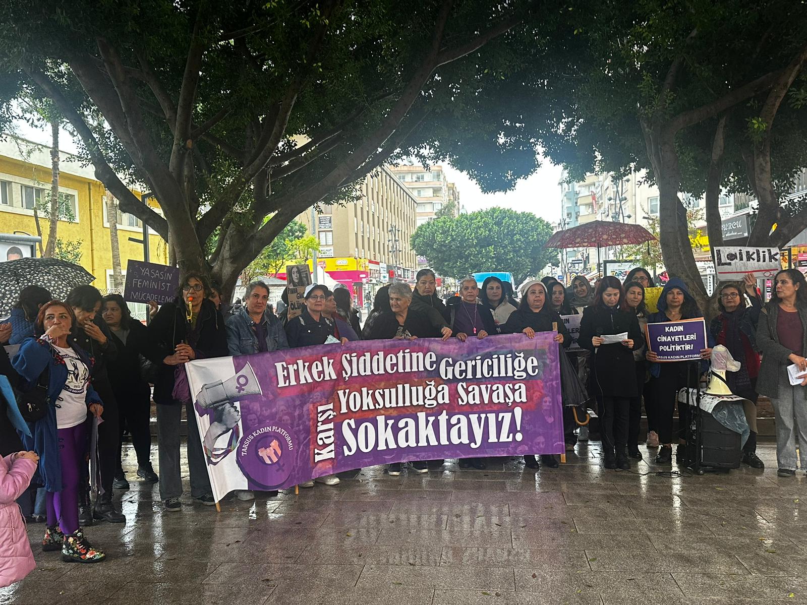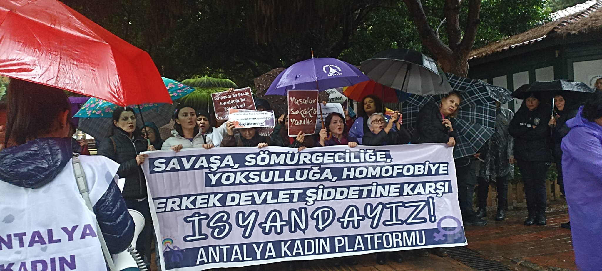 Antalya Kadın Platformu’nun çağrısıyla kadınlar yoğun yağmura rağmen Aydın Kanza Parkı’ndan Cumhuriyet Meydanı’na yürüdü. Cumhuriyet Meydanı’nda basın açıklaması yapıldı.