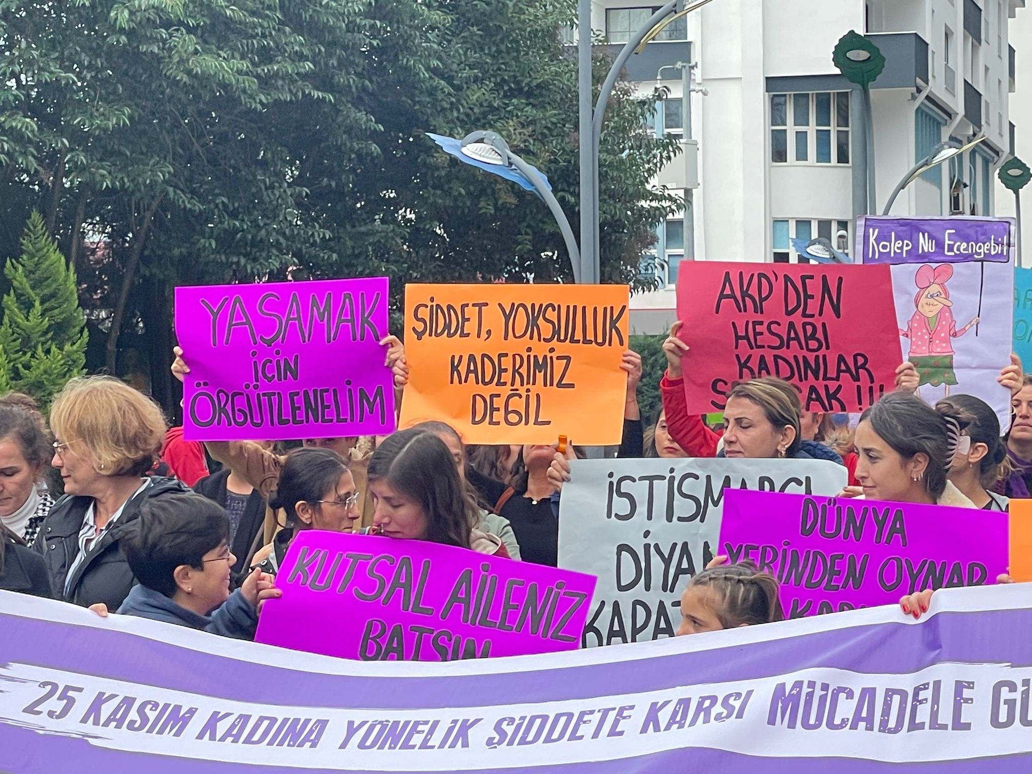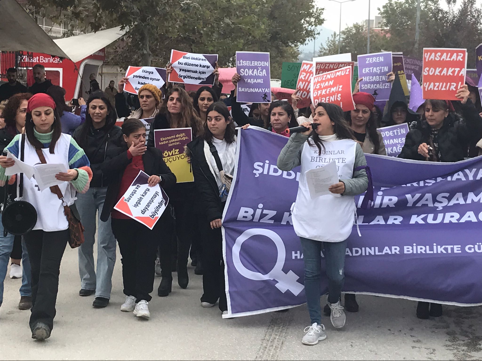Hatay Kadınlar Birlikte Güçlü’nün çağrısıyla bir araya gelen kadınlar “Şiddetinizle barışmayacağız! Yeni bir yaşamı biz kadınlar kuracağız!” yazılı bir pankart açıp Harbiye Yolu’nu trafiğe kapatarak Aşağıokçular Mahallesi’ne yürüdü.