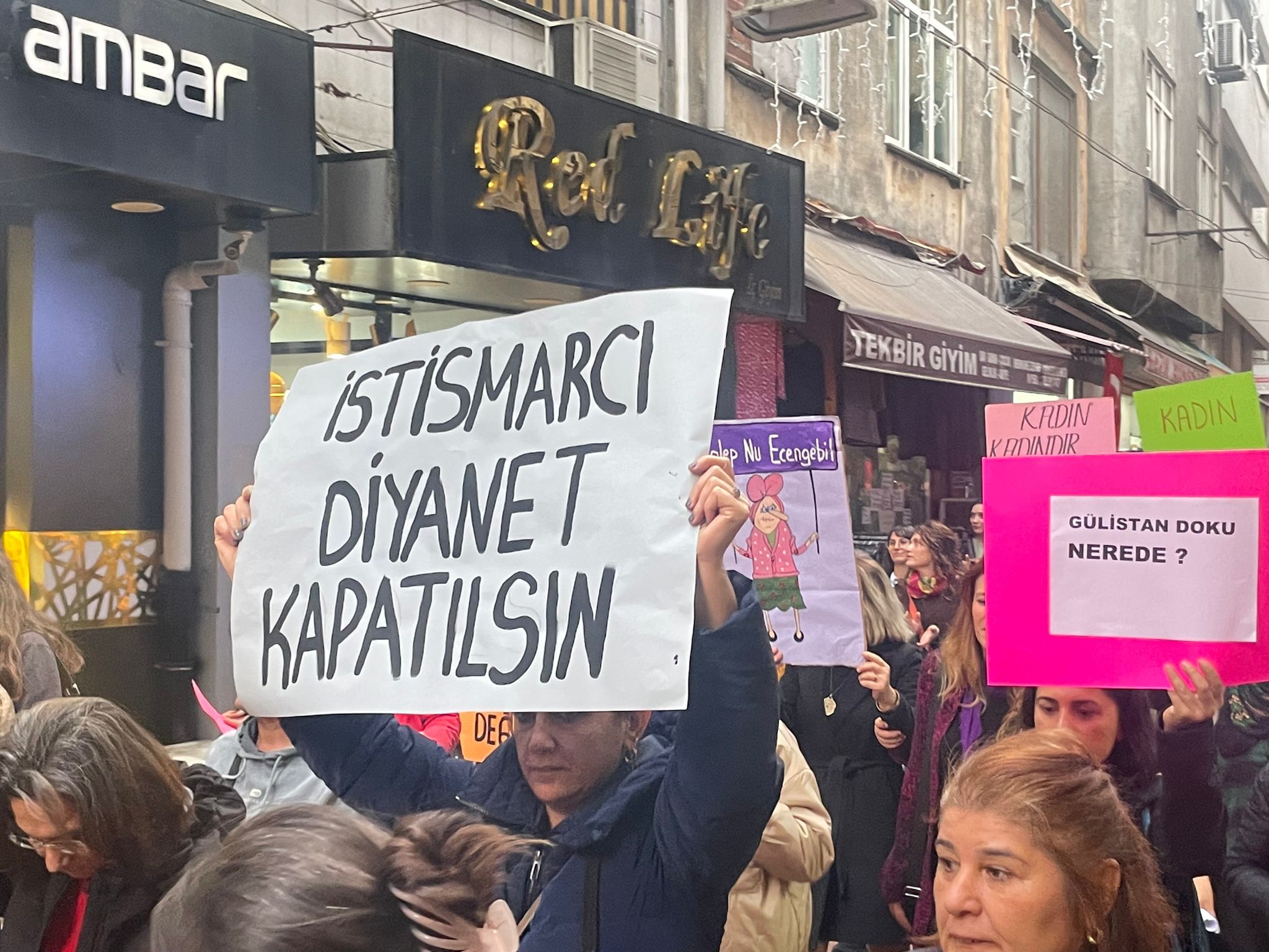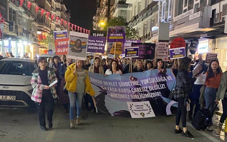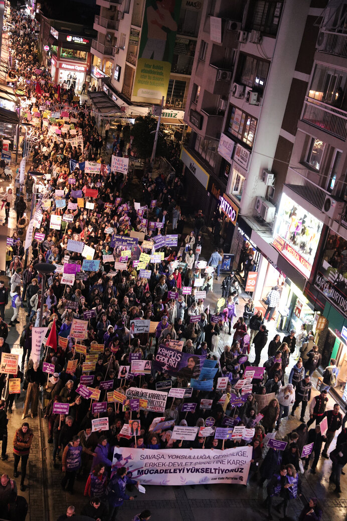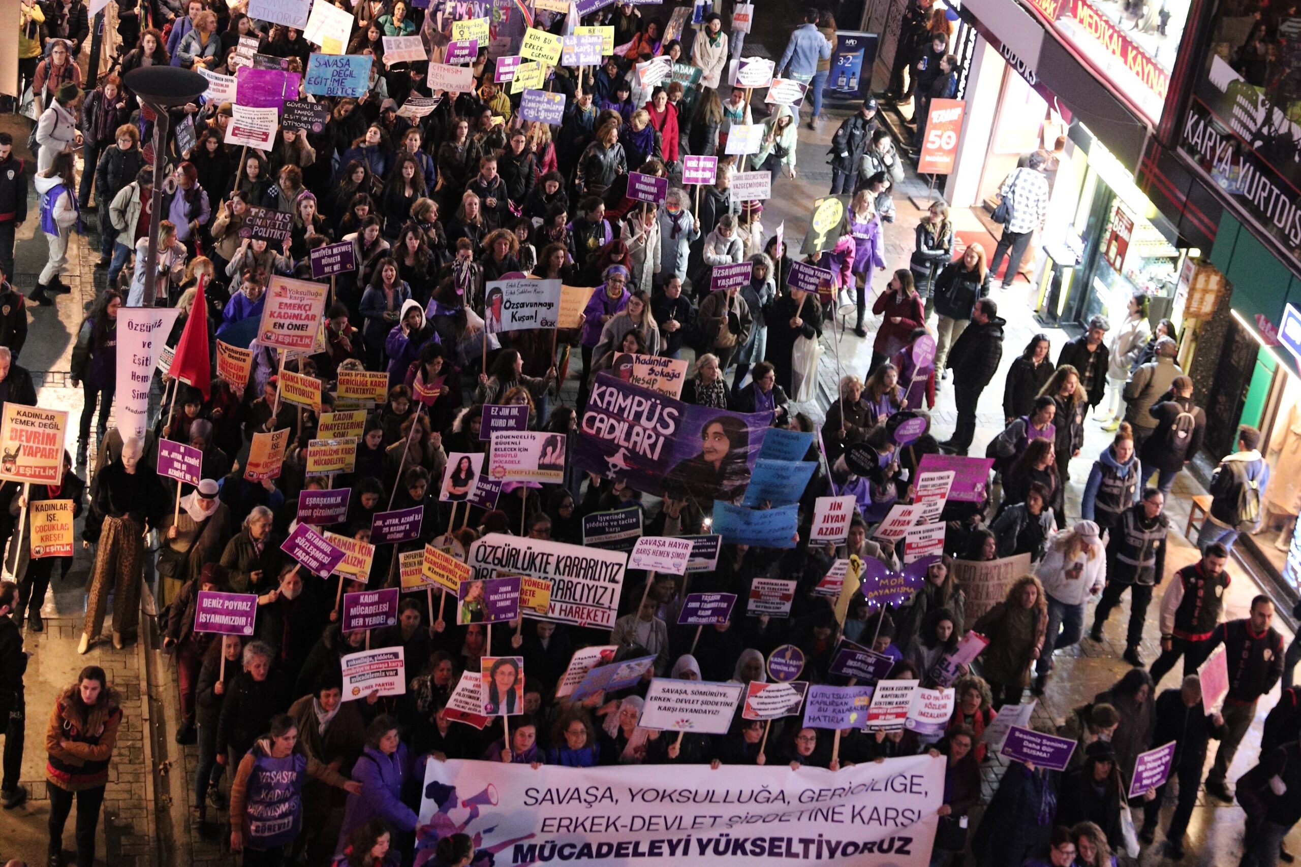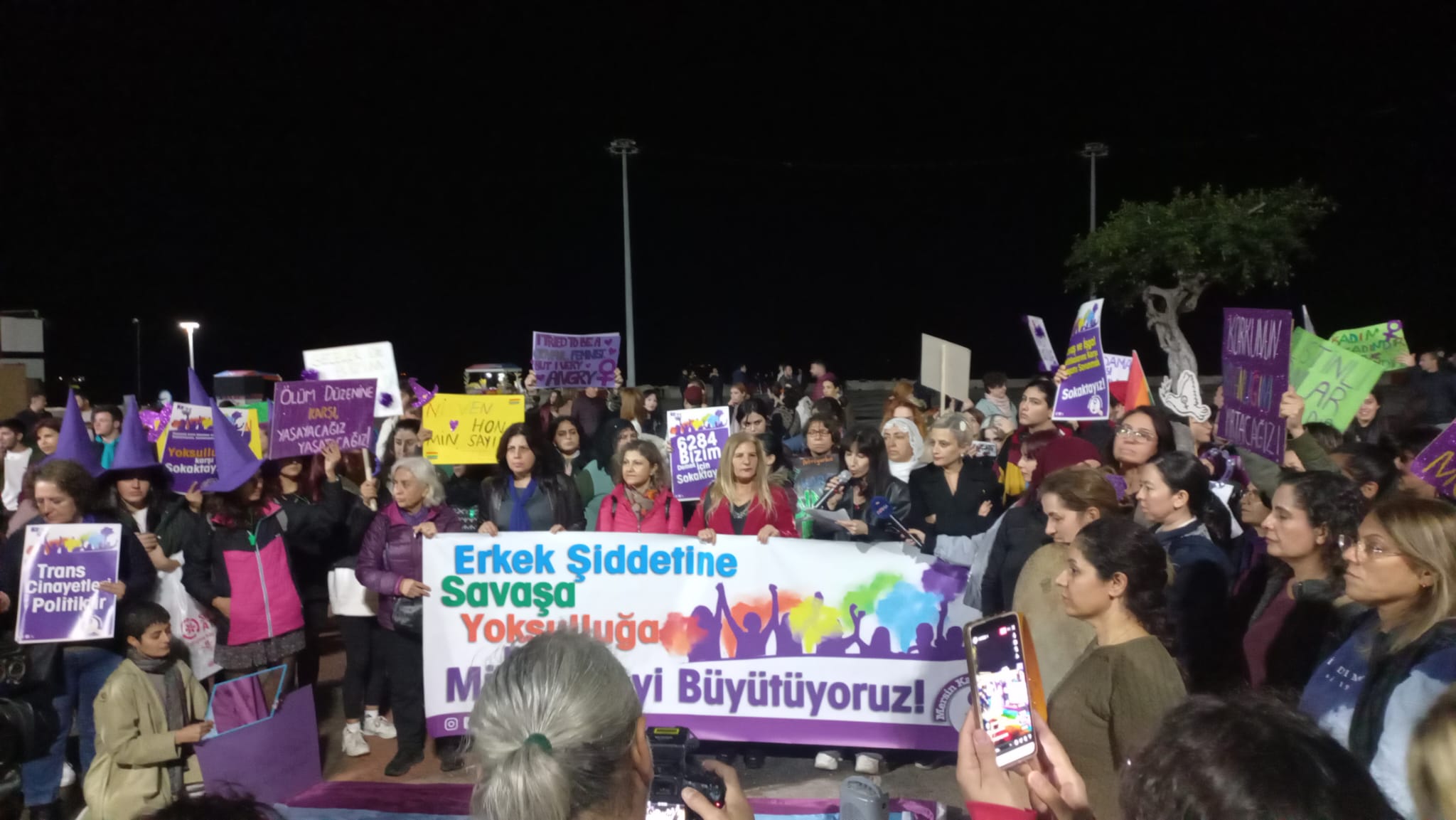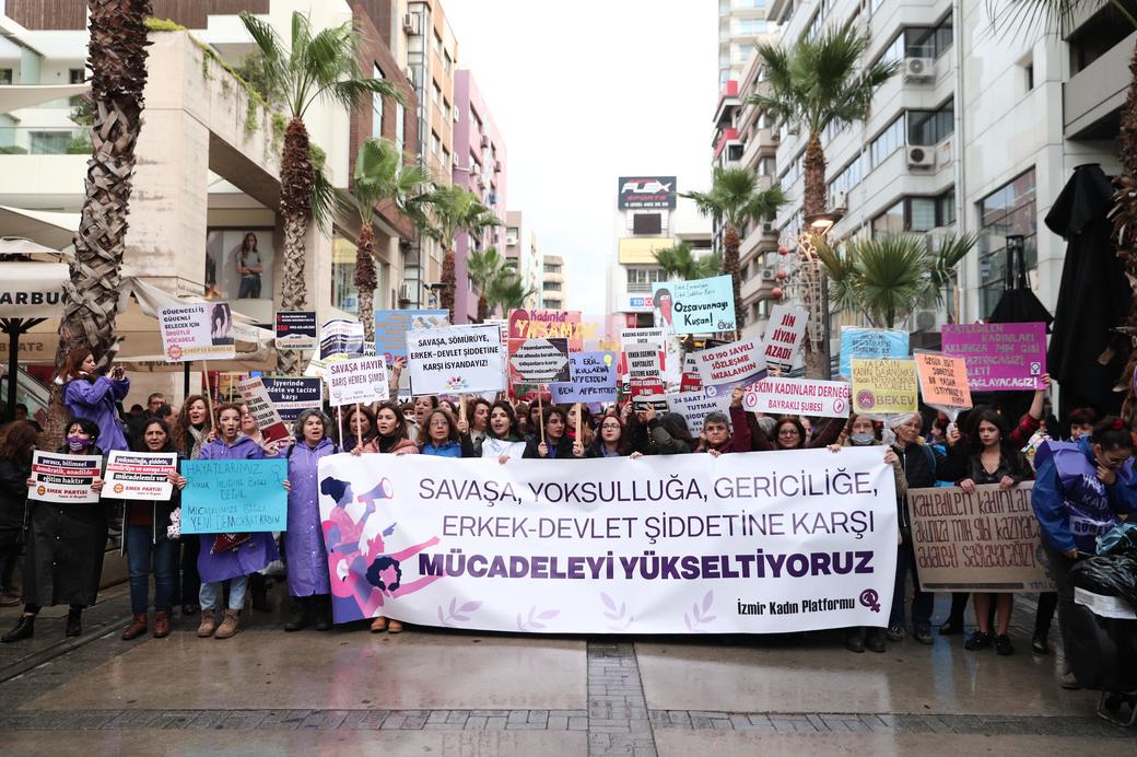 İzmir Kadın Platformu’nun çağrısıyla kadınlar ve LGBTİ+’lar “Savaşa, işgale, erkek-devlet şiddetine, yoksulluğa, sömürüye, homofobiye ve gericiliğe karşı” Alsancak’ta gar önünde buluşup eski Leman Kültür önüne yürüdü. Kitlesel yürüyüşün ardından basın açıklaması yapıldı.