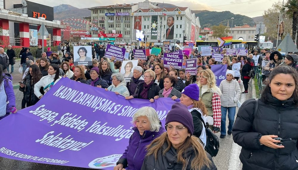 Bursa Kadın Platformu’nun çağrısıyla kadınlar Bursa’da Fomara Meydanı’nda bir araya geldi. “Geceleri de sokakları da meydanları da terk etmiyoruz”, “Kadınlar yürüyor mücadele büyüyor” sloganları eşliğinde Kent Meydanı’na yürüyen kadınlar burada hem Türkçe hem de Kürtçe basın açıklaması düzenledi.