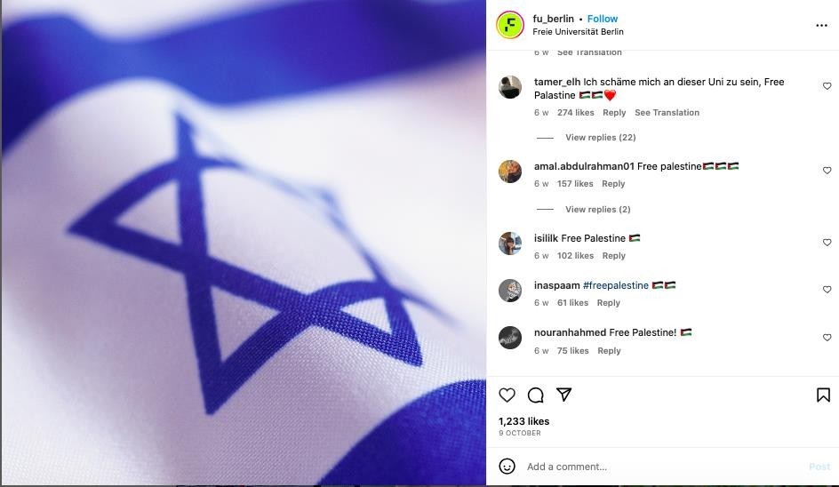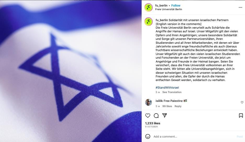 Berlin’deki üç büyük üniversiteden birisi olan Freie Üniversitesi eylemin 2 gün sonrasında, 9 Ekim 2023’te resmi Instagram sayfasında İsrail bayrağını da kullanarak bu paylaşımı yaptı: