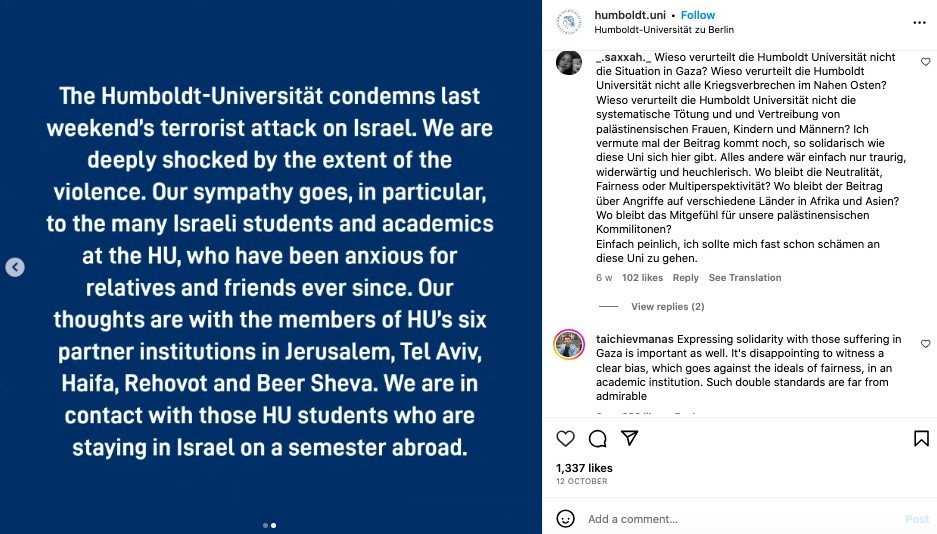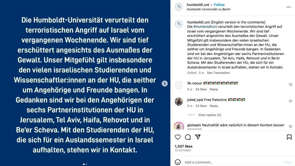 Diğer bir büyük üniversite olan Humboldt Üniversitesi ise benzer bir şekilde 12 Ekim 2023’te şöyle bir paylaşım yaptı: