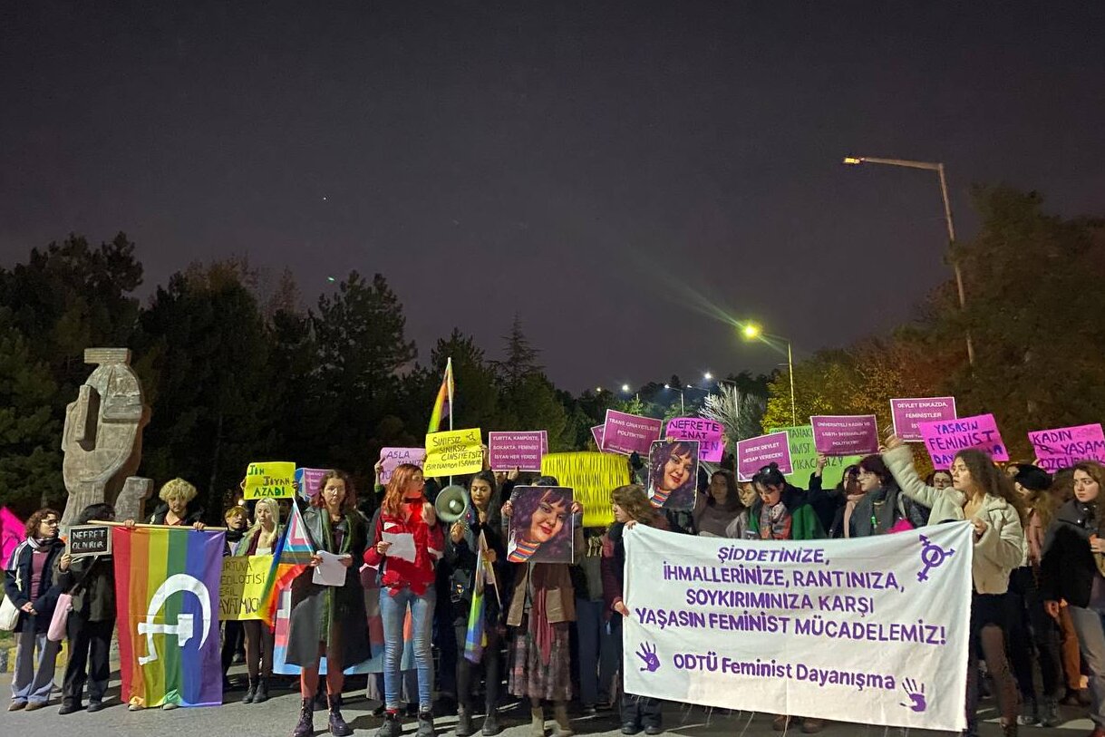 ODTÜ’lü kadınlar ve LGBTİ+lar bugün (23 Kasım) saat 18.00’da Matematik Duvarı önünde toplandı. Toplanan kadınlar ve LGBTİ+’lar feminist gece yürüyüşü yaptı. Yürüyüş sonrasında xte basın açıklaması okundu. Basın açıklamasında intihara sürüklenen, KYK yurtlarındaki ihmallerde hayatını kaybeden arkadaşlarını hatırlatan feministler; güvenli kampüsleri kuracaklarını ve patriyarkal şiddetin her biçimine karşı birlikte savaşacaklarını vurguladı.