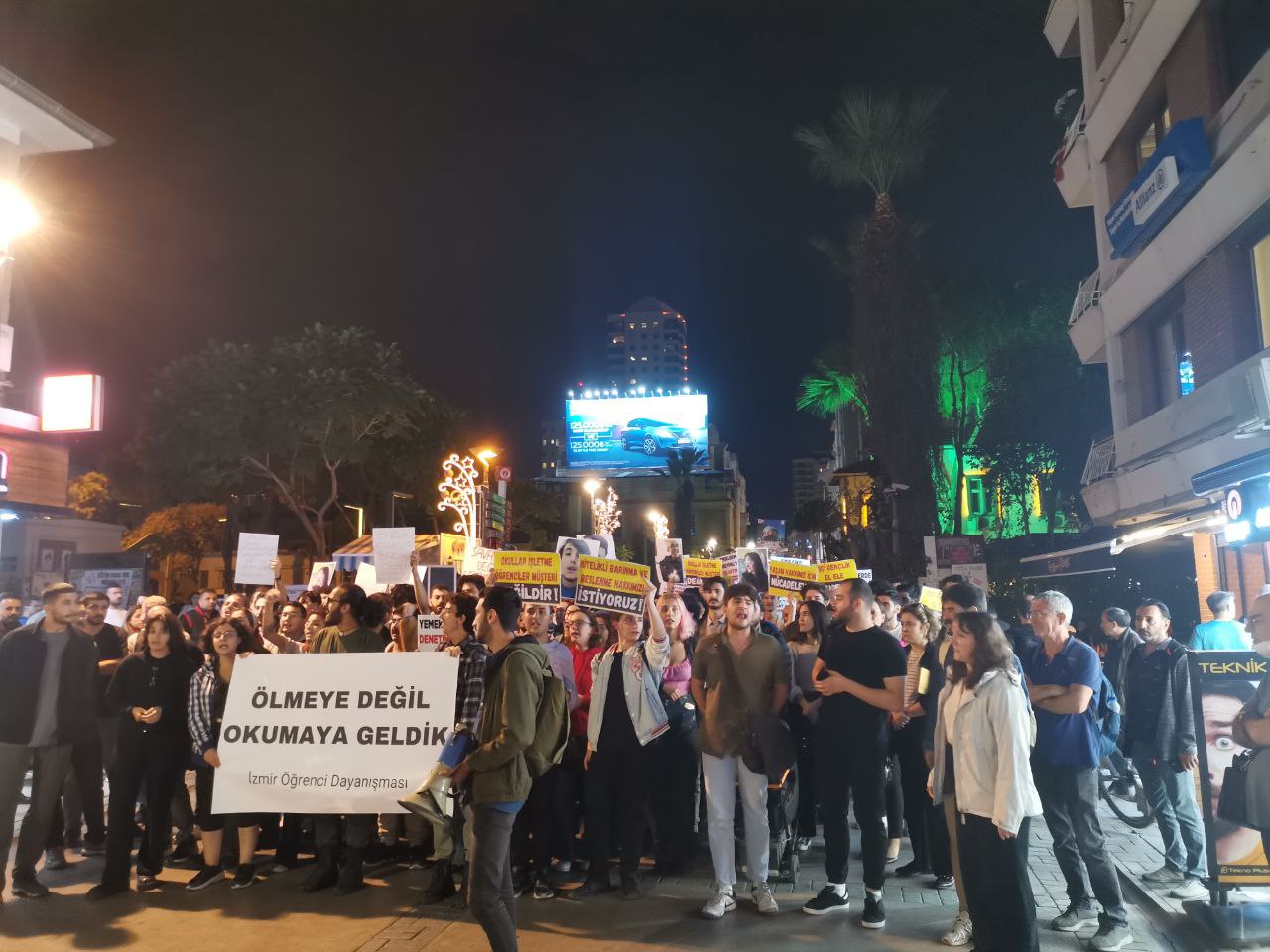 İzmir Öğrenci Dayanışması’nın çağrısıyla bugün (9 Kasım) saat 19.00’da Alsancak’ta bulunan Penguen Kitabevi önünde bir araya gelen üniversiteliler “Ölmeye değil okumaya geldik” pankartıyla yürüdü. Üniversiteliler nitelikli eğitim, barınma, beslenme hakları için yaptıkları yürüyüşte sık sık “Zeren’in hesabı sorulacak” sloganını attı.